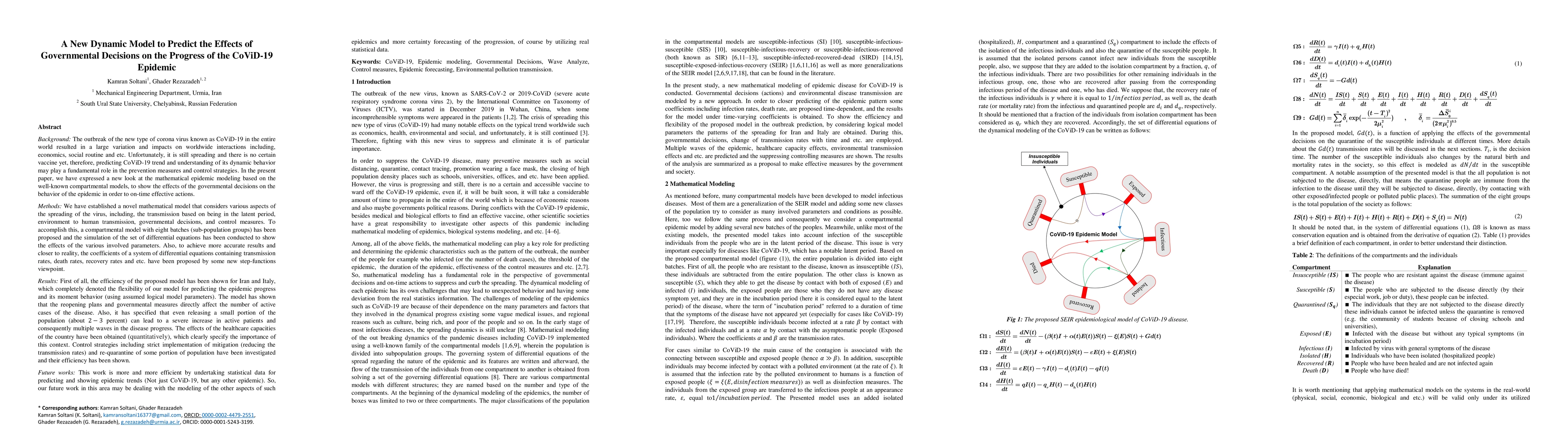 We have established a novel mathematical model that considers various aspects of the spreading of the virus, including, the transmission based on being in the latent period, environment to human transmission, governmental decisions, and control measures. To accomplish this, a compartmental model with eight batches (sub-population groups) has been proposed and the simulation of the set of differential equations has been conducted to show the effects of the various involved parameters. Also, to achieve more accurate results and closer to reality, the coefficients of a system of differential equations containing transmission rates, death rates, recovery rates and etc. have been proposed by some new step-functions viewpoint. Results: First of all, the efficiency of the proposed model has been shown for Iran and Italy, which completely denoted the flexibility of our model for predicting the epidemic progress and its moment behavior. The model has shown that the reopening plans and governmental measures directly affect the number of active cases of the disease. Also, it has specified that even releasing a small portion of the population (about 2-3 percent) can lead to a severe increase in active patients and consequently multiple waves in the disease progress. The effects of the healthcare capacities of the country have been obtained (quantitatively), which clearly specify the importance of this context. Control strategies including strict implementation of mitigation (reducing the transmission rates) and re-quarantine of some portion of population have been investigated and their efficiency has been shown.