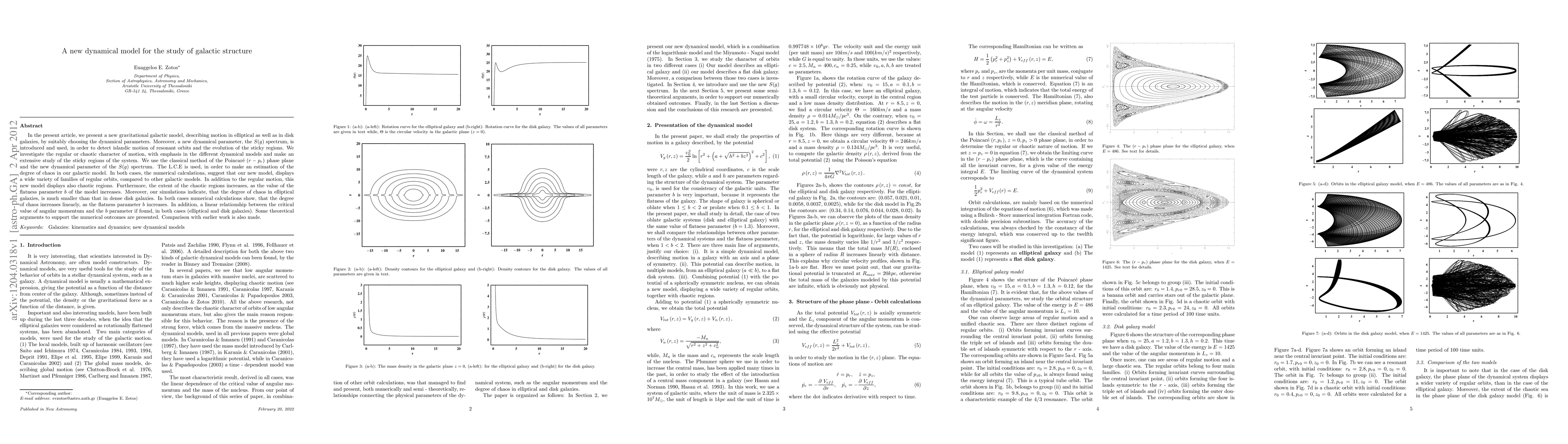In the present article, we present a new gravitational galactic model, describing motion in elliptical as well as in disk galaxies, by suitably choosing the dynamical parameters. Moreover, a new dynamical parameter, the S(g) spectrum, is introduced and used, in order to detect islandic motion of resonant orbits and the evolution of the sticky regions. We investigate the regular or chaotic character of motion, with emphasis in the different dynamical models and make an extensive study of the sticky regions of the system. We use the classical method of the Poincare (r-pr) phase plane and the new dynamical parameter of the S(g) spectrum. The LCE is used, in order to make an estimation of the degree of chaos in our galactic model. In both cases, the numerical calculations, suggest that our new model, displays a wide variety of families of regular orbits, compared to other galactic models. In addition to the regular motion, this new model displays also chaotic regions. Furthermore, the extent of the chaotic regions increases, as the value of the flatness parameter b of the model increases. Moreover, our simulations indicate, that the degree of chaos in elliptical galaxies, is much smaller than that in dense disk galaxies. In both cases numerical calculations show, that the degree of chaos increases linearly, as the flatness parameter b increases. In addition, a linear relationship between the critical value of angular momentum and the b parameter if found, in both cases (elliptical and disk galaxies). Some theoretical arguments to support the numerical outcomes are presented. Comparison with earlier work is also made.