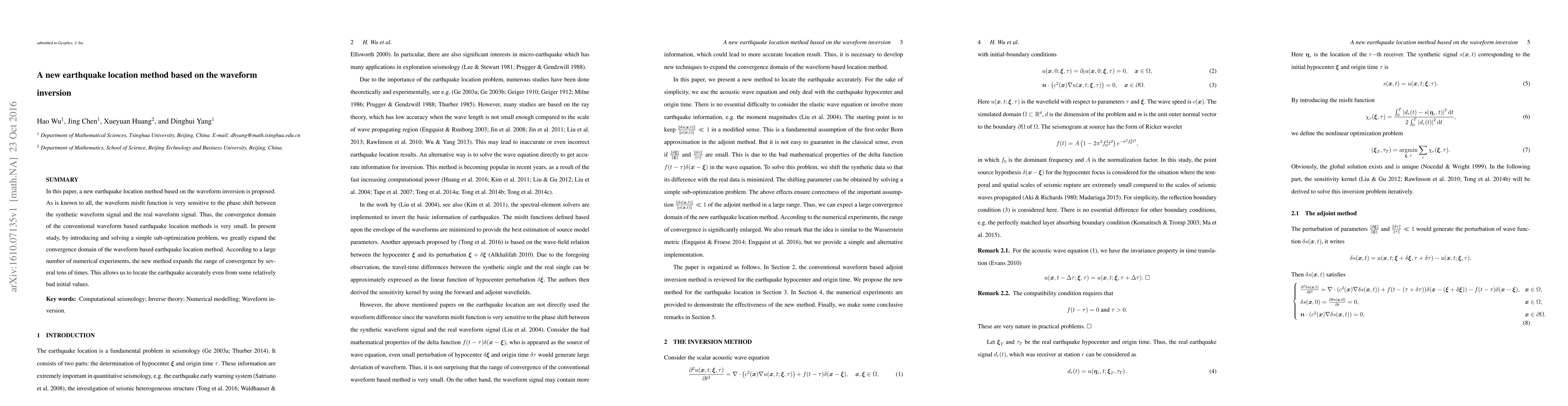 This paper proposes a novel earthquake location method using waveform inversion, which significantly expands the convergence domain by solving a sub-optimization problem. Numerical experiments show that the method improves accuracy by several tens of times, enabling precise location even from poor initial estimates.