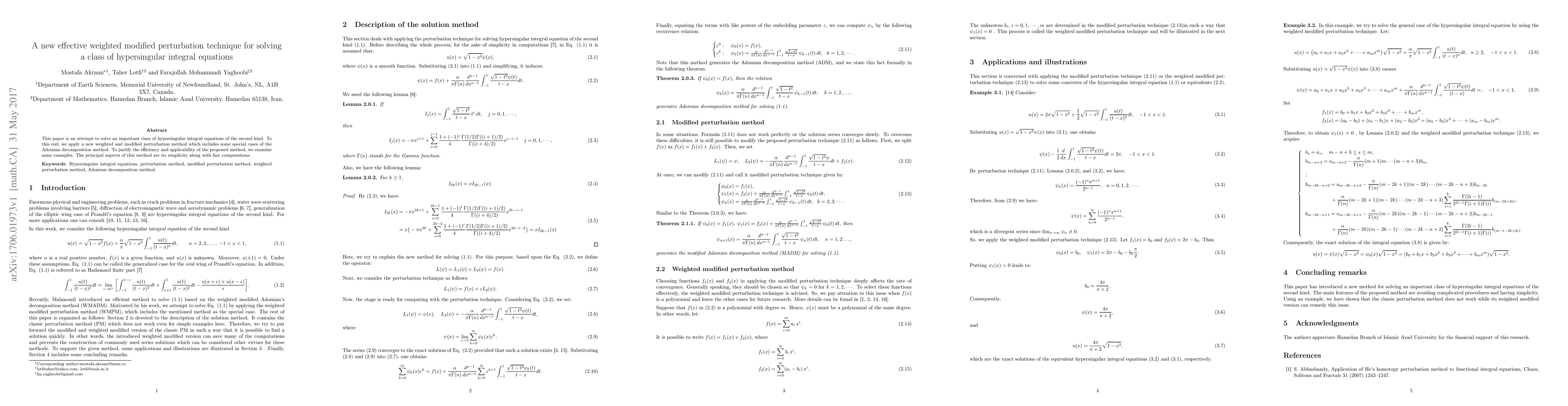 This paper introduces a new weighted modified perturbation technique for solving hypersingular integral equations of the second kind, combining elements of the Adomian decomposition method. The proposed method is shown to be both simple and computationally efficient through practical examples.