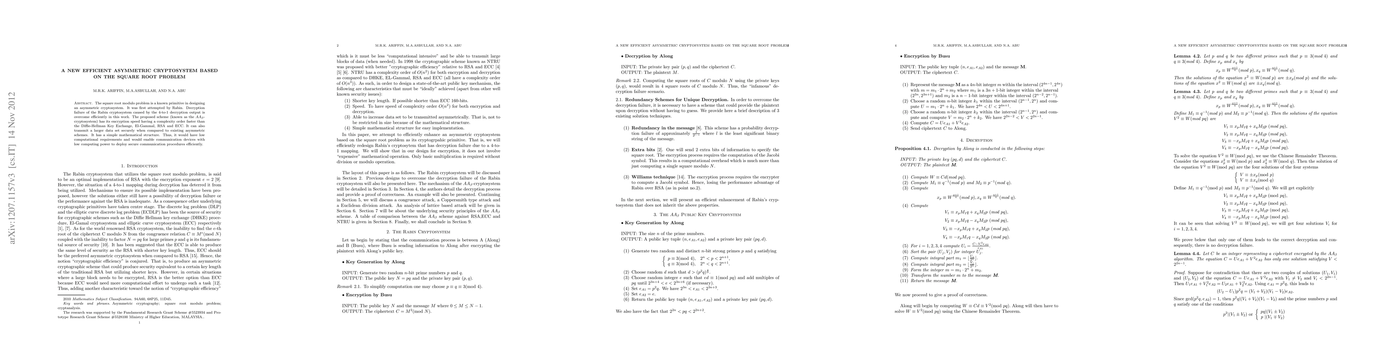 This paper proposes a new asymmetric cryptosystem, AA_\beta, based on the square root problem, offering faster encryption than Diffie-Hellman, El-Gammal, RSA, and ECC, and enabling secure transmission of larger datasets with lower computational requirements. It addresses the decryption failure issue of the Rabin cryptosystem by overcoming the 4-to-1 decryption output.
