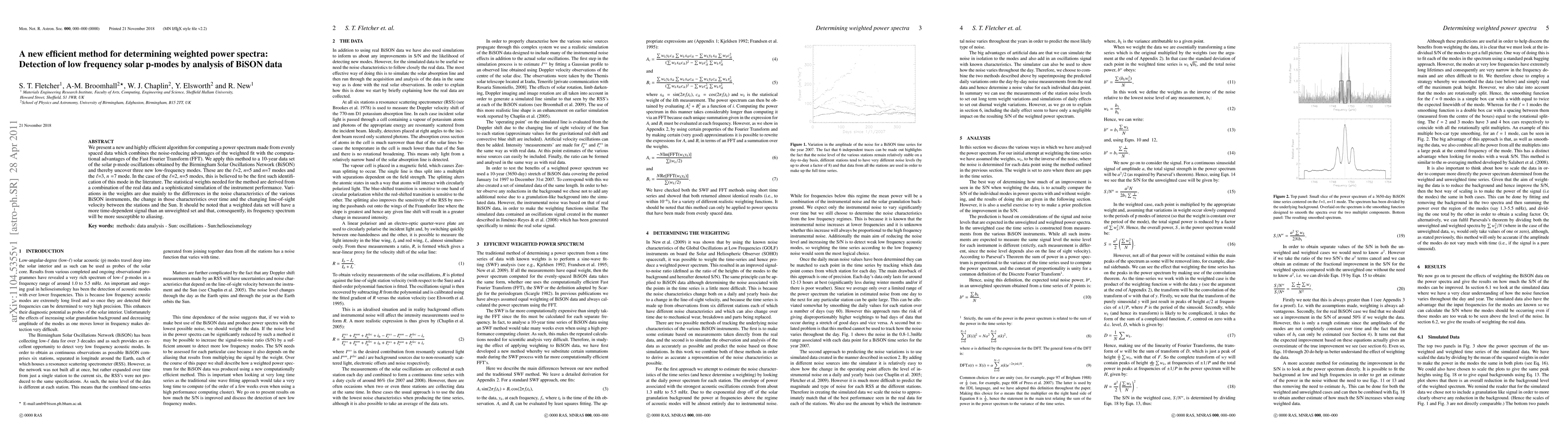 We present a new and highly efficient algorithm for computing a power spectrum made from evenly spaced data which combines the noise-reducing advantages of the weighted fit with the computational advantages of the Fast Fourier Transform (FFT). We apply this method to a 10-year data set of the solar p-mode oscillations obtained by the Birmingham Solar Oscillations Network (BiSON) and thereby uncover three new low-frequency modes. These are the l=2, n=5 and n=7 modes and the l=3, n=7 mode. In the case of the l=2, n=5 modes, this is believed to be the first such identification of this mode in the literature. The statistical weights needed for the method are derived from a combination of the real data and a sophisticated simulation of the instrument performance. Variations in the weights are due mainly to the differences in the noise characteristics of the various BiSON instruments, the change in those characteristics over time and the changing line-of-sight velocity between the stations and the Sun. It should be noted that a weighted data set will have a more time-dependent signal than an unweighted set and that, consequently, its frequency spectrum will be more susceptible to aliasing.