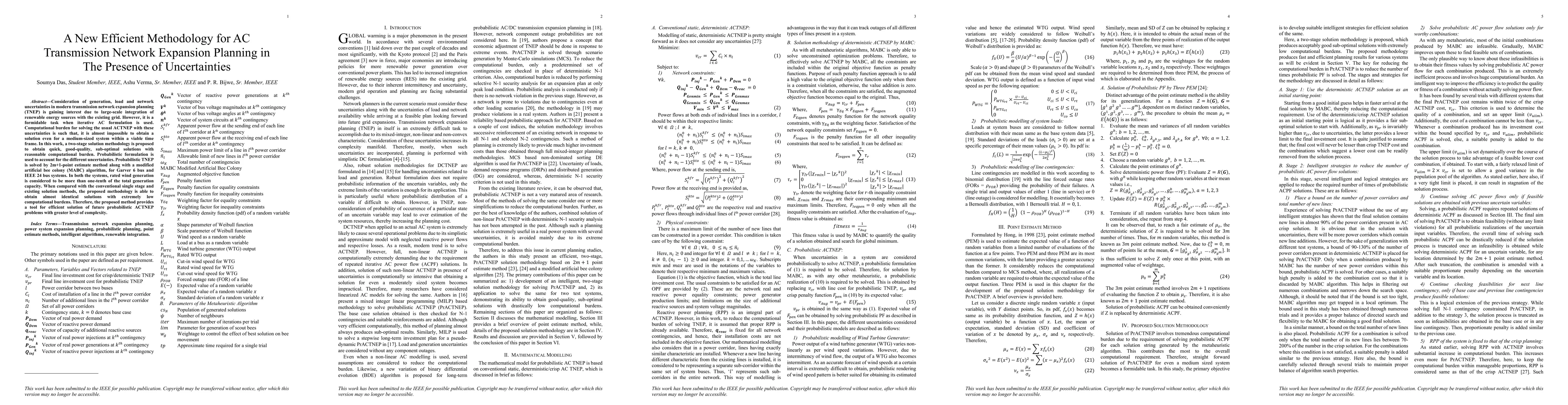This paper proposes a two-stage methodology for efficient AC transmission network expansion planning (TNEP) under uncertainties, using a probabilistic formulation and a modified artificial bee colony algorithm. The approach significantly reduces computational burden while maintaining solution quality, demonstrated on Garver 6 bus and IEEE 24 bus systems with high renewable energy integration.