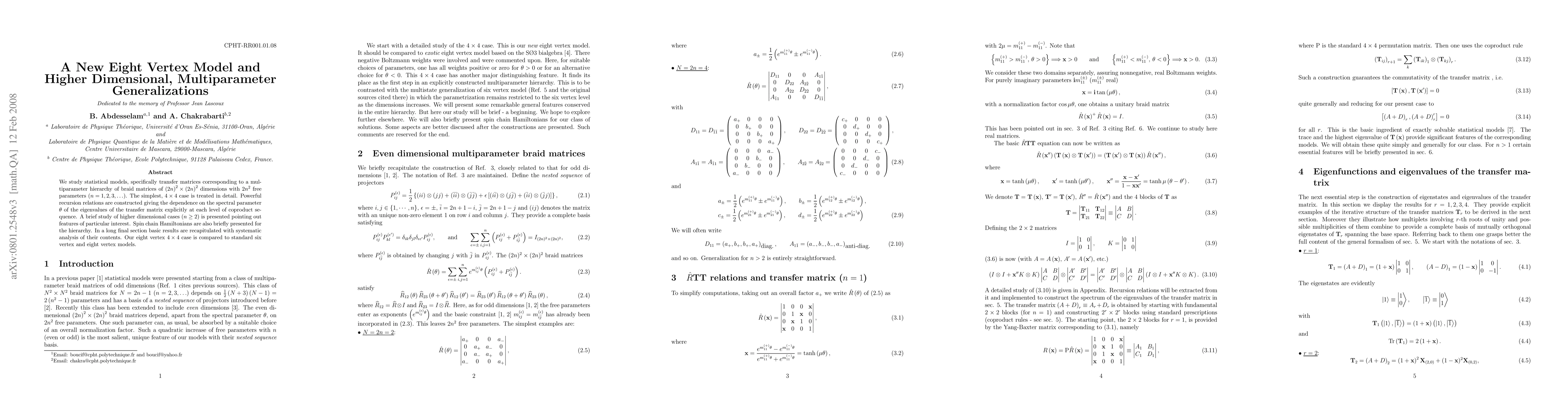 We study statistical models, specifically transfer matrices corresponding to a multiparameter hierarchy of braid matrices of $(2n)^2\times(2n)^2$ dimensions with $2n^2$ free parameters $(n=1,2,3,...)$. The simplest, $4\times 4$ case is treated in detail. Powerful recursion relations are constructed giving the dependence on the spectral parameter $\theta$ of the eigenvalues of the transfer matrix explicitly at each level of coproduct sequence. A brief study of higher dimensional cases ($n\geq 2$) is presented pointing out features of particular interest. Spin chain Hamiltonians are also briefly presented for the hierarchy. In a long final section basic results are recapitulated with systematic analysis of their contents. Our eight vertex $4\times 4$ case is compared to standard six vertex and eight vertex models.