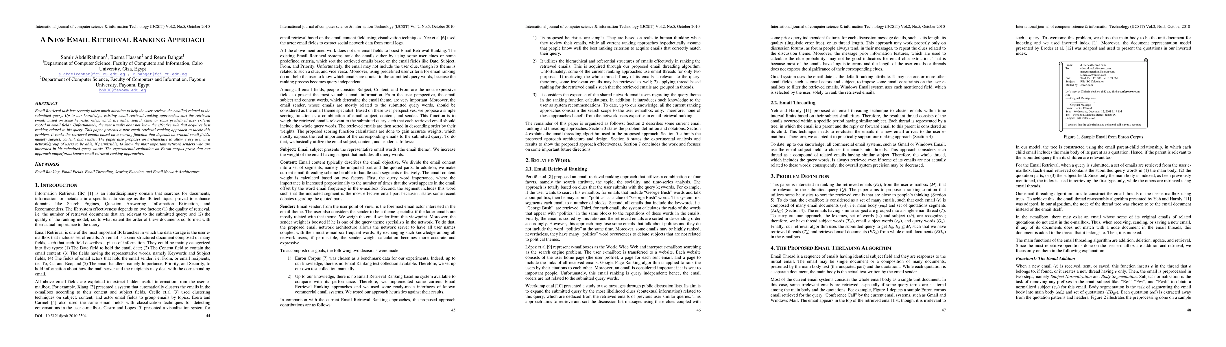 This paper introduces a novel email retrieval ranking approach that ranks emails based on a scoring function considering subject, content, and sender fields, outperforming existing heuristic methods. It also proposes a network architecture allowing users to identify significant senders relevant to their queries, with experimental validation showing superior performance on the Enron corpus.