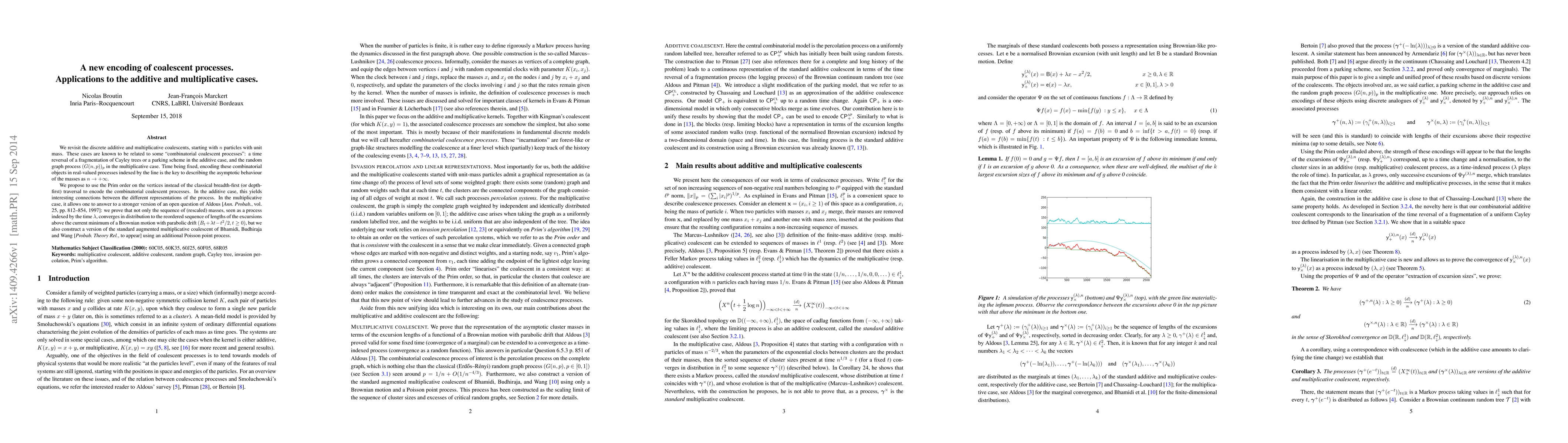 We revisit the discrete additive and multiplicative coalescents, starting with $n$ particles with unit mass. These cases are known to be related to some "combinatorial coalescent processes": a time reversal of a fragmentation of Cayley trees or a parking scheme in the additive case, and the random graph process $(G(n,p))_p$ in the multiplicative case. Time being fixed, encoding these combinatorial objects in real-valued processes indexed by the line is the key to describing the asymptotic behaviour of the masses as $n\to +\infty$. We propose to use the Prim order on the vertices instead of the classical breadth-first (or depth-first) traversal to encode the combinatorial coalescent processes. In the additive case, this yields interesting connections between the different representations of the process. In the multiplicative case, it allows one to answer to a stronger version of an open question of Aldous [Ann. Probab., vol. 25, pp. 812--854, 1997]: we prove that not only the sequence of (rescaled) masses, seen as a process indexed by the time $\lambda$, converges in distribution to the reordered sequence of lengths of the excursions above the current minimum of a Brownian motion with parabolic drift $(B_t+\lambda t - t^2/2, t\geq 0)$, but we also construct a version of the standard augmented multiplicative coalescent of Bhamidi, Budhiraja and Wang [Probab. Theory Rel., to appear] using an additional Poisson point process.
