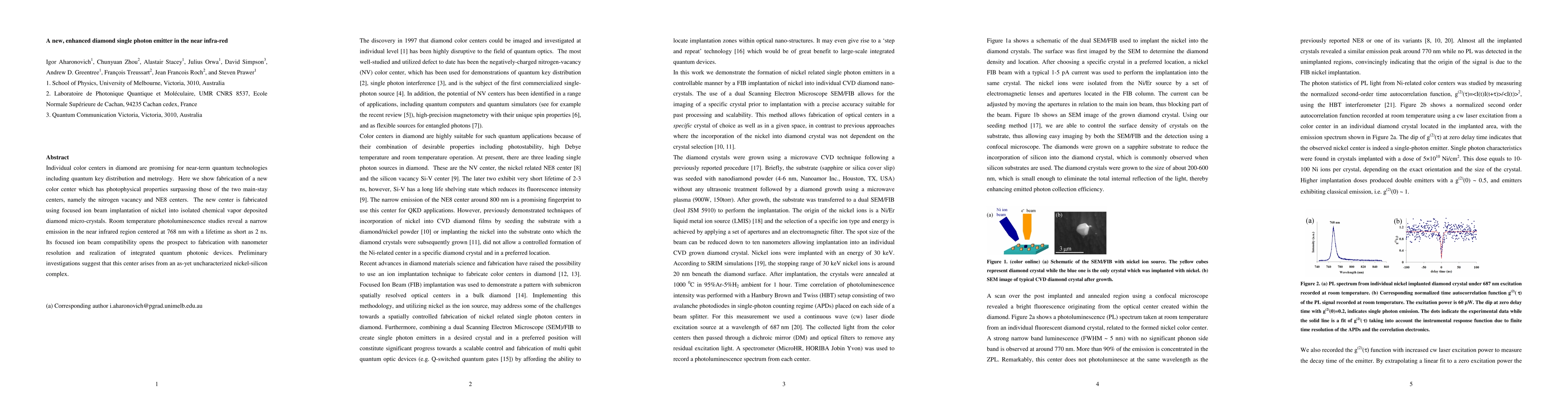 This paper introduces a novel diamond single photon emitter created via nickel implantation, which exhibits superior photophysical properties compared to existing nitrogen vacancy and NE8 centers. The new center's near-infrared emission at 768 nm and short 2 ns lifetime, along with its fabrication compatibility, suggests potential for advanced quantum technologies and integrated photonic devices.