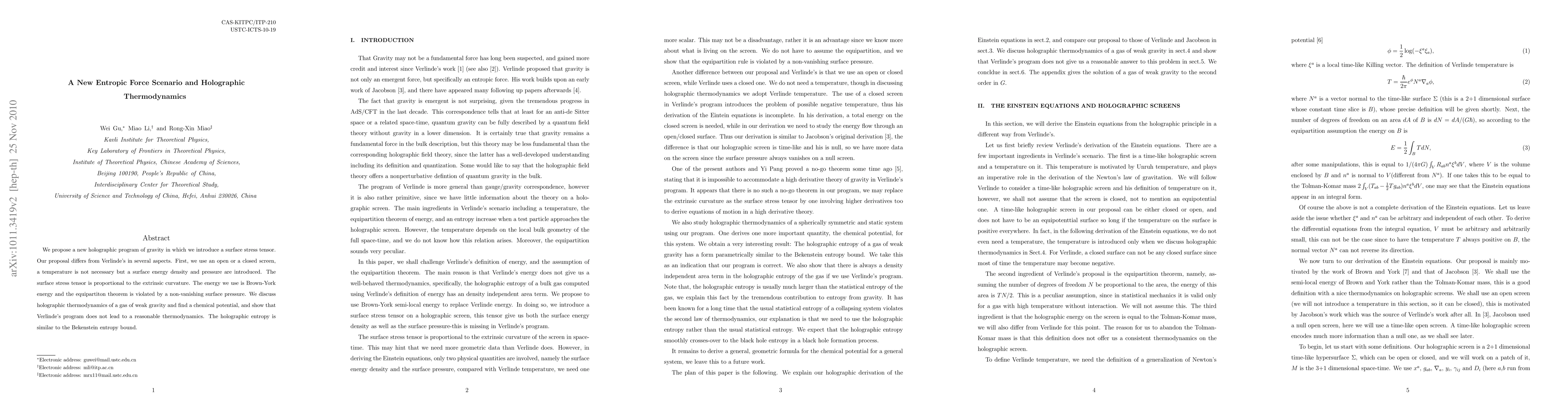 We propose a new holographic program of gravity in which we introduce a surface stress tensor. Our proposal differs from Verlinde's in several aspects. First, we use an open or a closed screen, a temperature is not necessary but a surface energy density and pressure are introduced. The surface stress tensor is proportional to the extrinsic curvature. The energy we use is Brown-York energy and the equipartiton theorem is violated by a non-vanishing surface pressure. We discuss holographic thermodynamics of a gas of weak gravity and find a chemical potential, and show that Verlinde's program does not lead to a reasonable thermodynamics. The holographic entropy is similar to the Bekenstein entropy bound.
