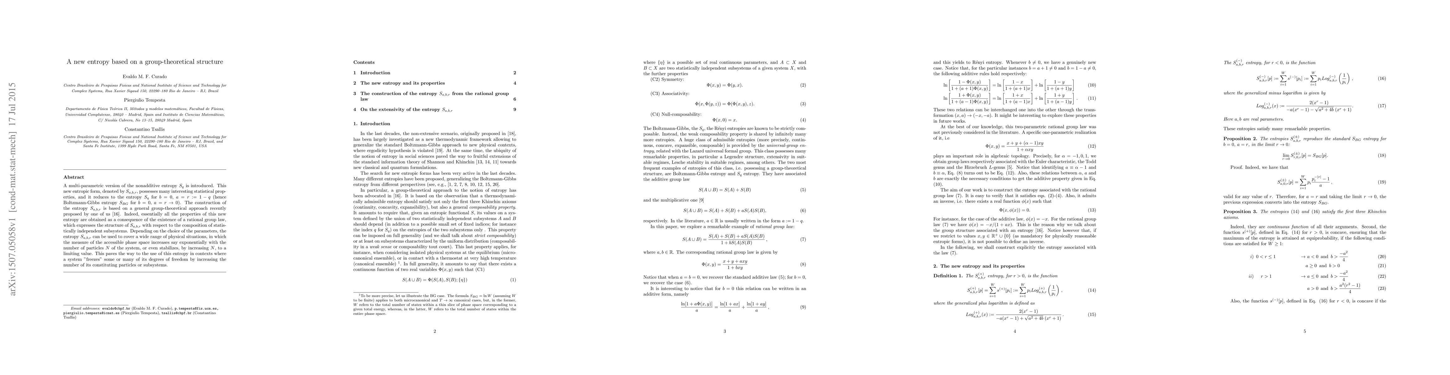 A multi-parametric version of the nonadditive entropy $S_{q}$ is introduced. This new entropic form, denoted by $S_{a,b,r}$, possesses many interesting statistical properties, and it reduces to the entropy $S_q$ for $b=0$, $a=r:=1-q$ (hence Boltzmann-Gibbs entropy $S_{BG}$ for $b=0$, $a=r \to 0$). The construction of the entropy $S_{a,b,r}$ is based on a general group-theoretical approach recently proposed by one of us \cite{Tempesta2}. Indeed, essentially all the properties of this new entropy are obtained as a consequence of the existence of a rational group law, which expresses the structure of $S_{a,b,r}$ with respect to the composition of statistically independent subsystems. Depending on the choice of the parameters, the entropy $S_{a,b,r}$ can be used to cover a wide range of physical situations, in which the measure of the accessible phase space increases say exponentially with the number of particles $N$ of the system, or even stabilizes, by increasing $N$, to a limiting value. This paves the way to the use of this entropy in contexts where a system "freezes" some or many of its degrees of freedom by increasing the number of its constituting particles or subsystems.