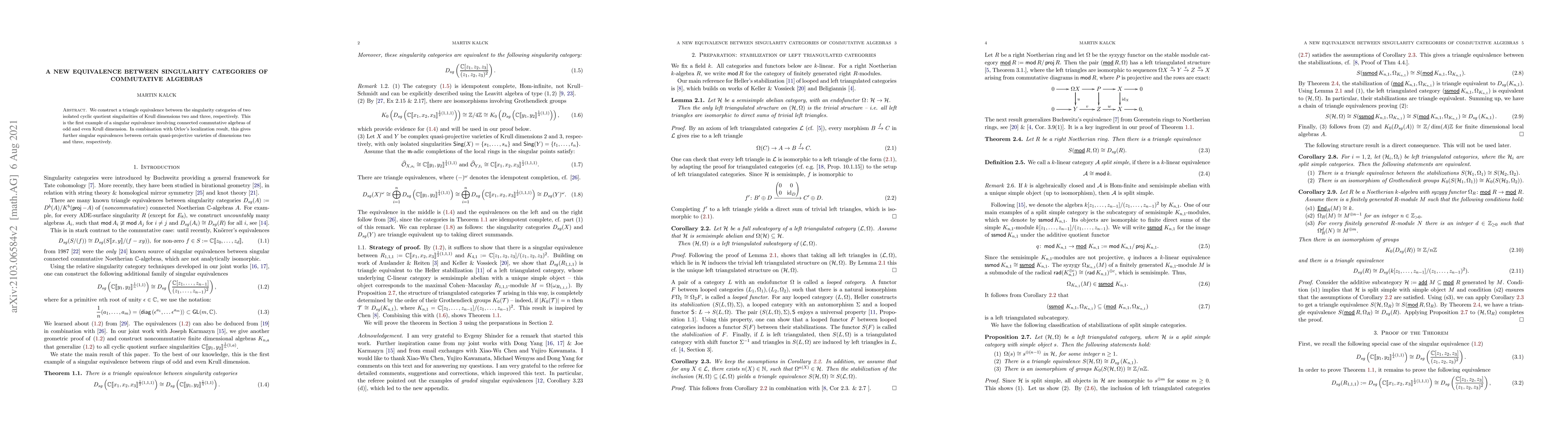 We construct a triangle equivalence between the singularity categories of two isolated cyclic quotient singularities of Krull dimensions two and three, respectively. This is the first example of a singular equivalence involving connected commutative algebras of odd and even Krull dimension. In combination with Orlov's localization result, this gives further singular equivalences between certain quasi-projective varieties of dimensions two and three, respectively.