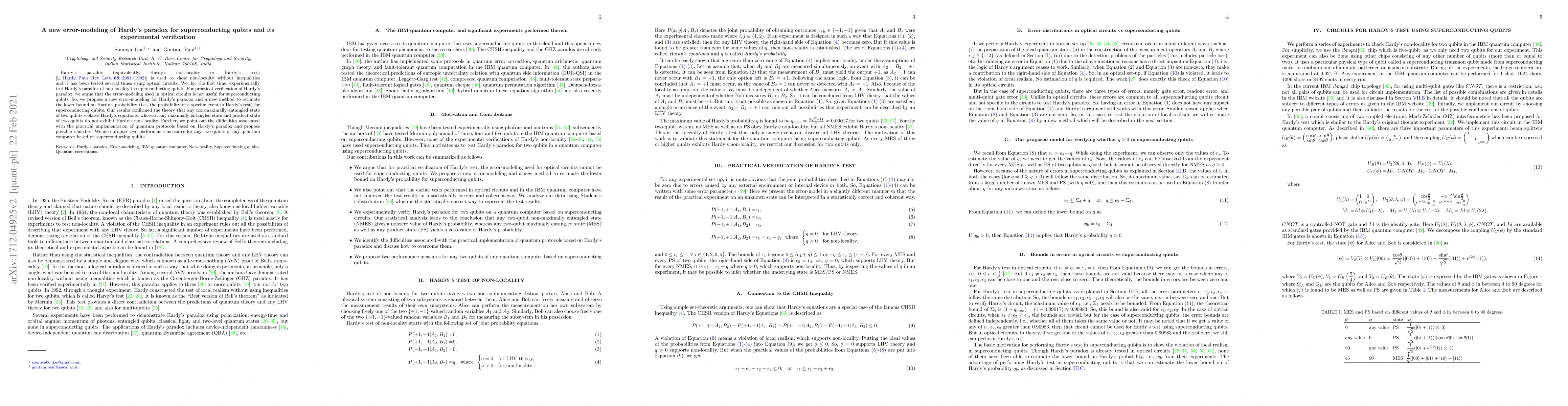 This paper proposes a new error-modeling for Hardy's paradox to verify non-locality in superconducting qubits, finding that non-maximally entangled states violate Hardy's equations while maximally entangled states do not. It also discusses practical challenges and proposes performance measures for superconducting qubits.