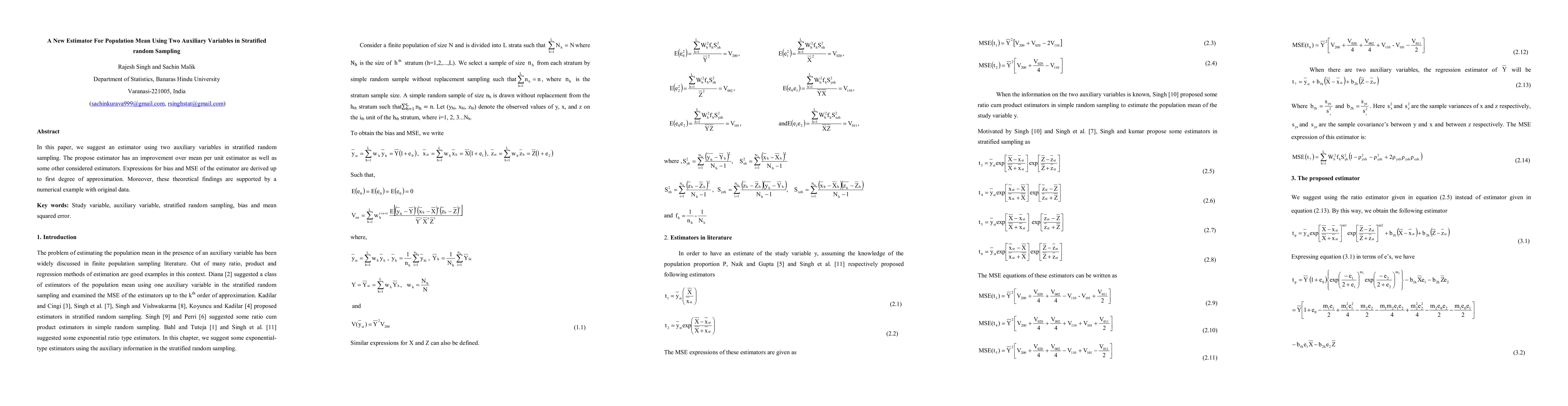 This paper proposes a new estimator for the population mean using two auxiliary variables in stratified random sampling, demonstrating improved performance over existing estimators. Theoretical expressions for bias and mean squared error are derived and validated with a numerical example using original data.