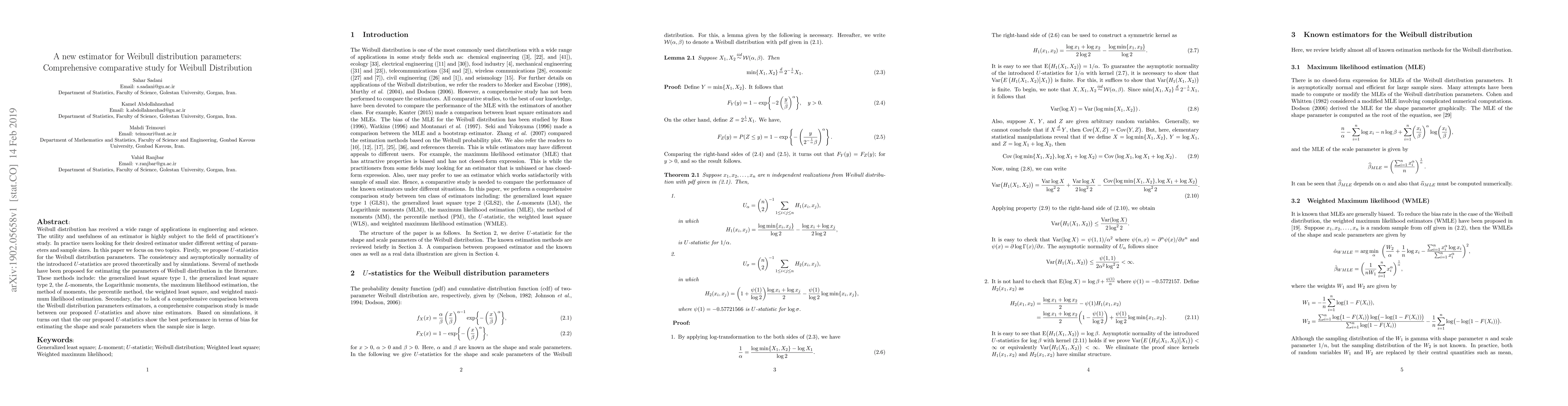 This paper proposes $U$-statistics for estimating Weibull distribution parameters and proves their consistency and asymptotic normality. A comprehensive comparative study shows that the proposed $U$-statistics outperform nine existing methods, particularly in bias reduction for large sample sizes.
