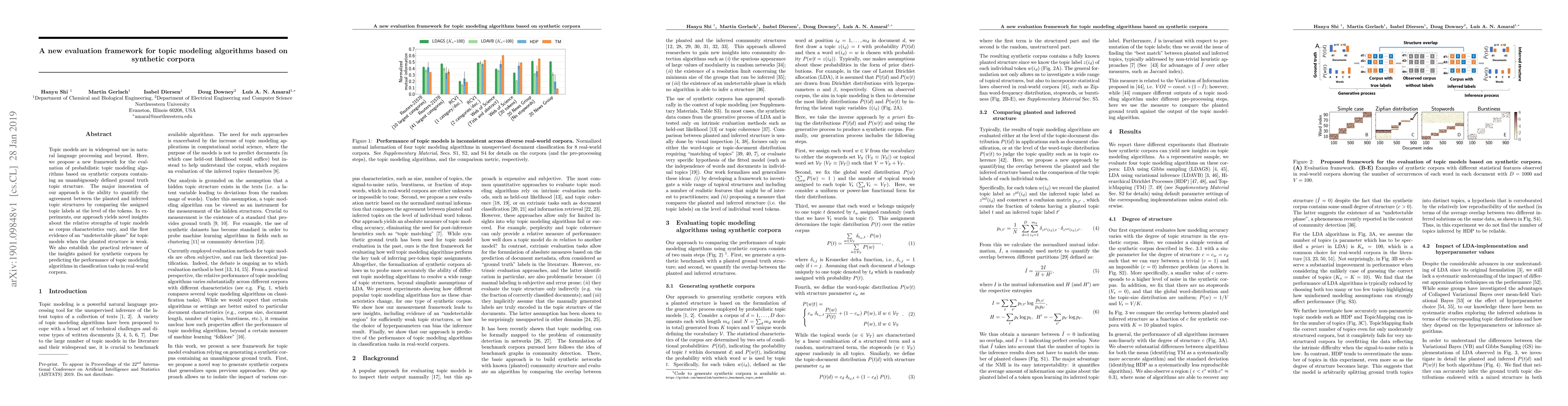 This paper introduces a novel evaluation framework for probabilistic topic modeling algorithms using synthetic corpora with a defined ground truth. The framework quantifies agreement between inferred and planted topic structures at the token level, revealing insights into model performance and identifying an "undetectable phase" for weak topic structures, while also predicting real-world performance.