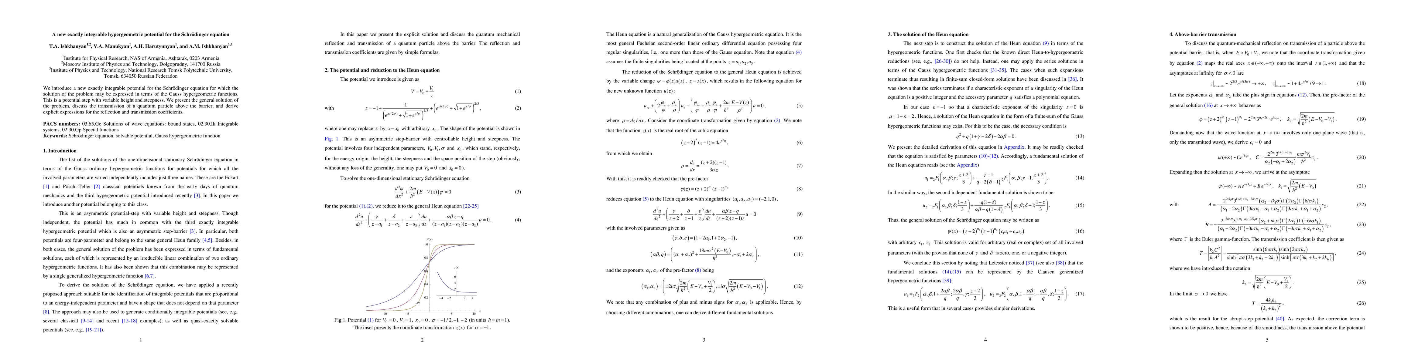 We introduce a new exactly integrable potential for the Schr\"odinger equation for which the solution of the problem may be expressed in terms of the Gauss hypergeometric functions. This is a potential step with variable height and steepness. We present the general solution of the problem, discuss the transmission of a quantum particle above the barrier, and derive explicit expressions for the reflection and transmission coefficients.
