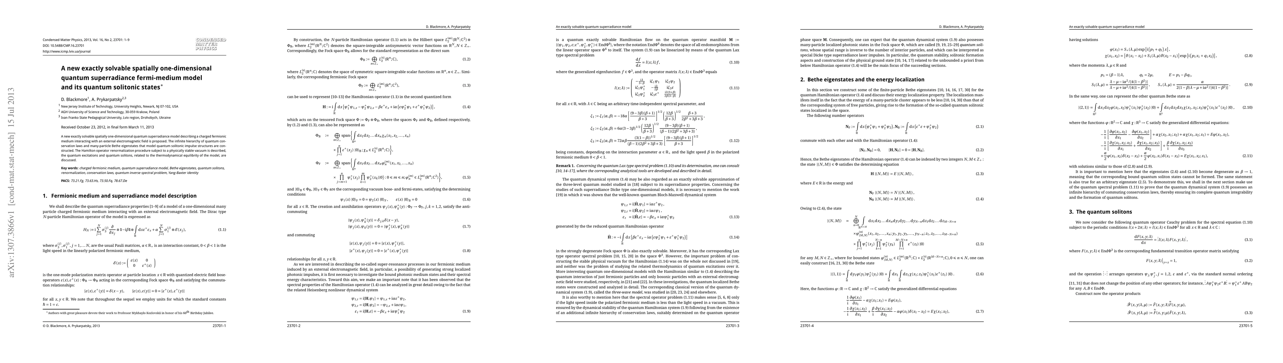 A new exactly solvable spatially one-dimensional quantum superradiance model describing a charged fermionic medium interacting with an external electromagnetic field is proposed. The infinite hierarchy of quantum conservation laws and many-particle Bethe eigenstates that model quantum solitonic impulse structures are constructed. The Hamilton operator renormalization procedure subject to a physically stable vacuum is described, the quantum excitations and quantum solitons, related to the thermodynamical equilibrity of the model, are discussed.
