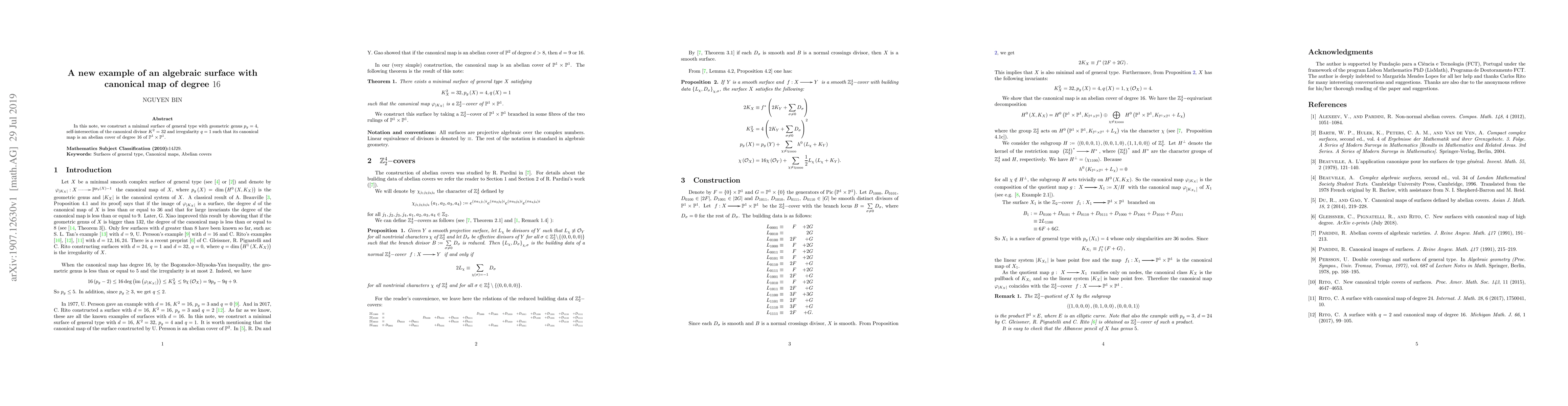 In this note, we construct a minimal surface of general type with geometric genus p g = 4, self-intersection of the canonical divisor K^2 = 32 and irregularity q = 1 such that its canonical map is an abelian cover of degree 16 of P^1 x P^1.