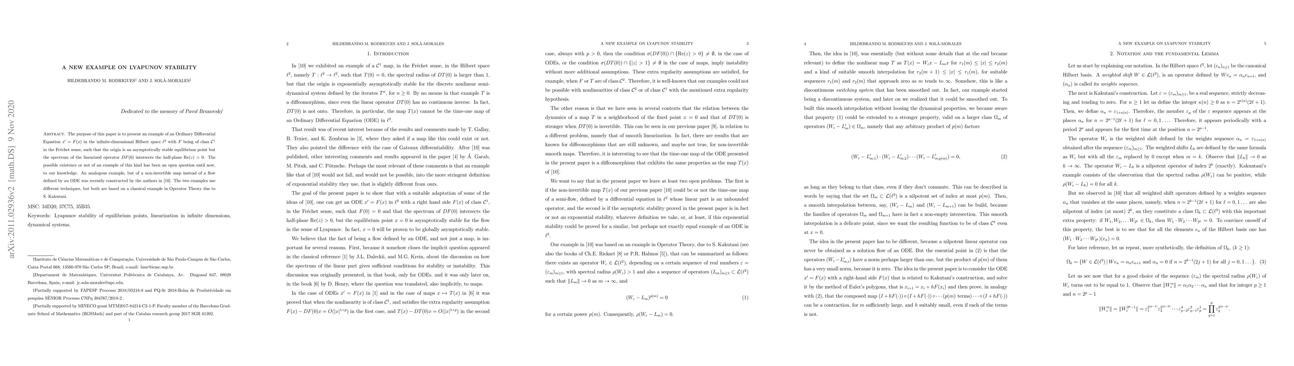 The paper presents an example of an Ordinary Differential Equation (ODE) in the infinite-dimensional Hilbert space ℓ², demonstrating that the origin is an asymptotically stable equilibrium point despite the spectrum of the linearized operator intersecting the half-plane Re(z) > 0.