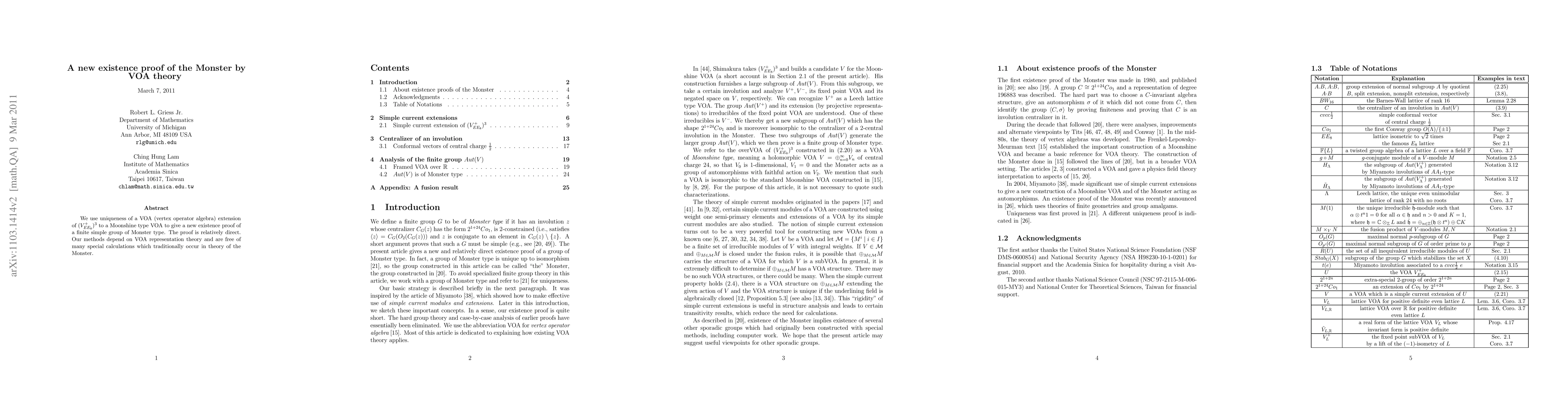 We use uniqueness of a VOA (vertex operator algebra) extension of $(V_{EE_8}^+)^3$ to a Moonshine type VOA to give a new existence proof of a finite simple group of Monster type. The proof is relatively direct. Our methods depend on VOA representation theory and are free of many special calculations which traditionally occur in theory of the Monster.
