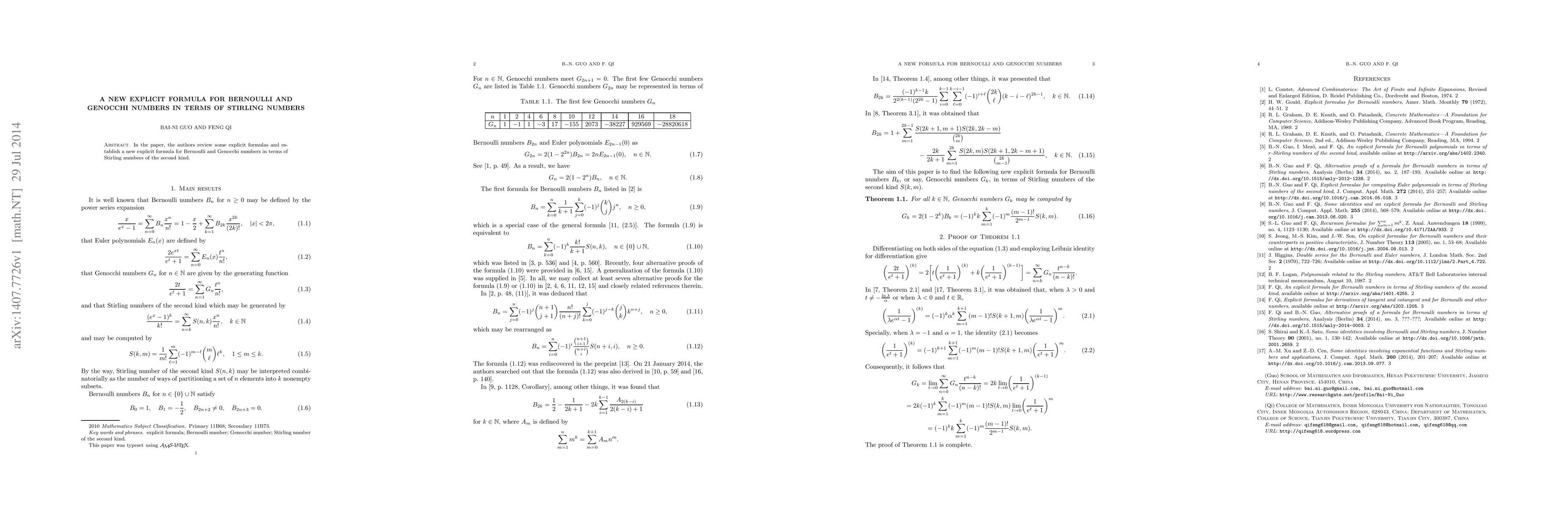 Summary: This paper presents a new explicit formula linking Bernoulli and Genocchi numbers to Stirling numbers of the second kind, enhancing the understanding of their interrelations. The authors review existing formulas and introduce this novel representation.