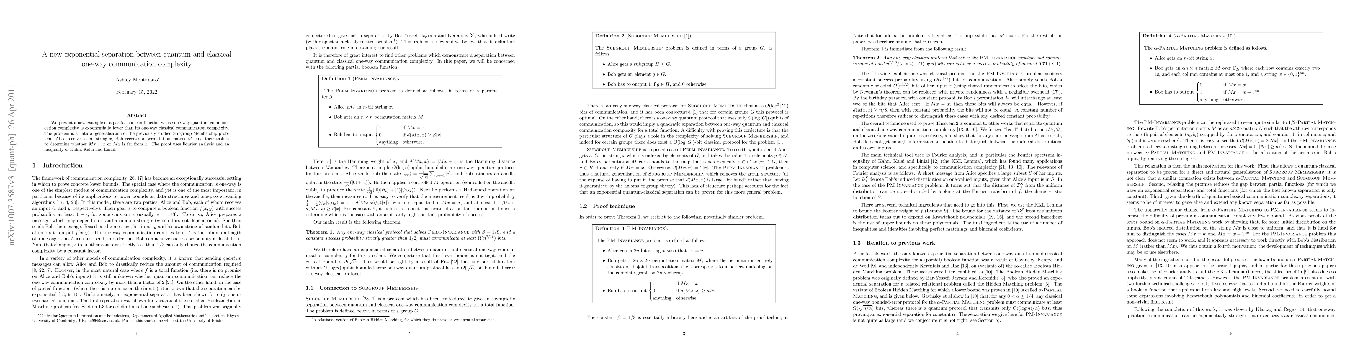 We present a new example of a partial boolean function whose one-way quantum communication complexity is exponentially lower than its one-way classical communication complexity. The problem is a natural generalisation of the previously studied Subgroup Membership problem: Alice receives a bit string x, Bob receives a permutation matrix M, and their task is to determine whether Mx=x or Mx is far from x. The proof uses Fourier analysis and an inequality of Kahn, Kalai and Linial.