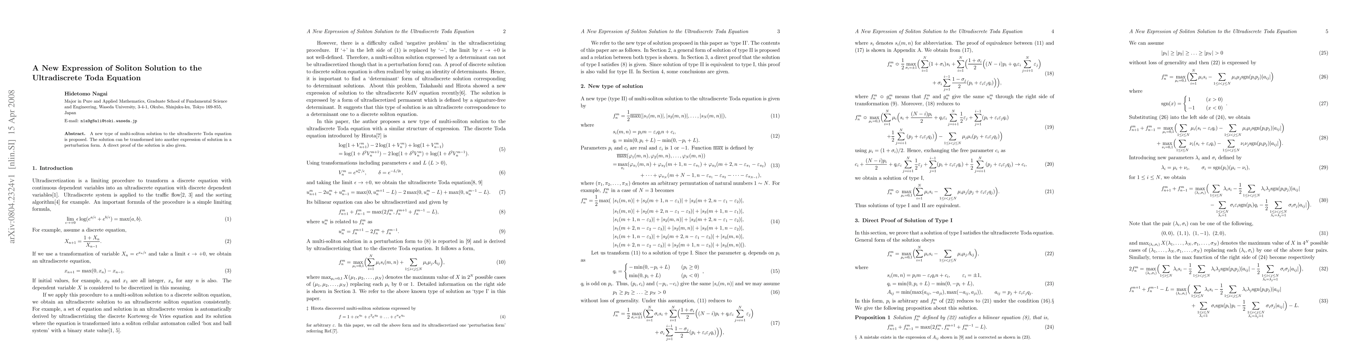 A new type of multi-soliton solution to the ultradiscrete Toda equation is proposed. The solution can be transformed into another expression of solution in a perturbation form. A direct proof of the solution is also given.