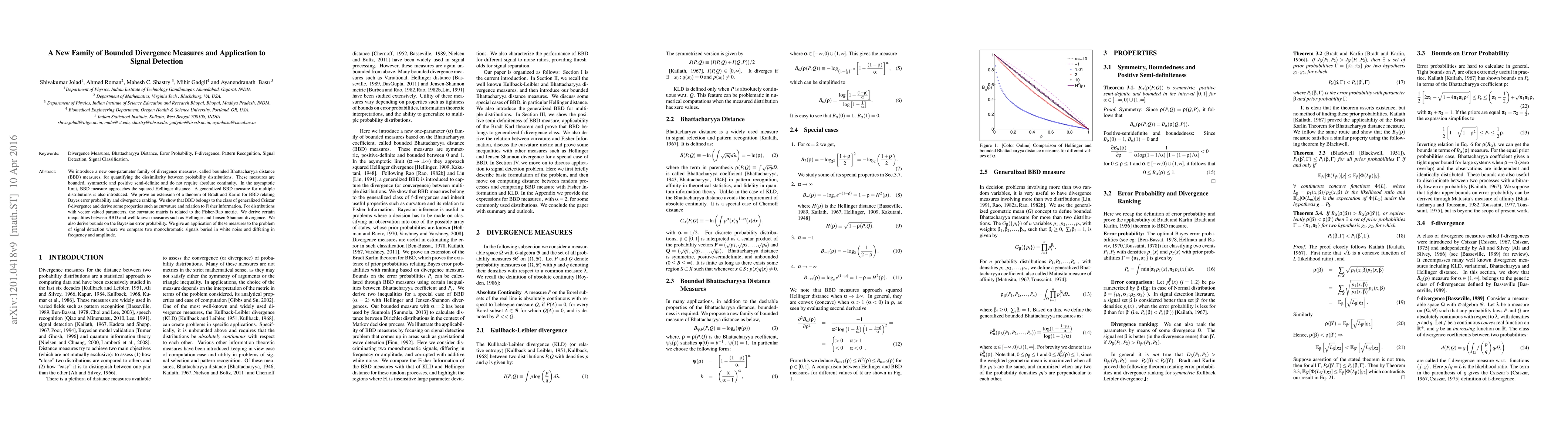 This paper introduces a new family of bounded divergence measures called bounded Bhattacharyya distance (BBD) for quantifying distribution dissimilarity, showing their properties and applications in signal detection. The BBD measures are bounded, symmetric, and extend to multiple distributions, with applications demonstrated in distinguishing monochromatic signals in noise.