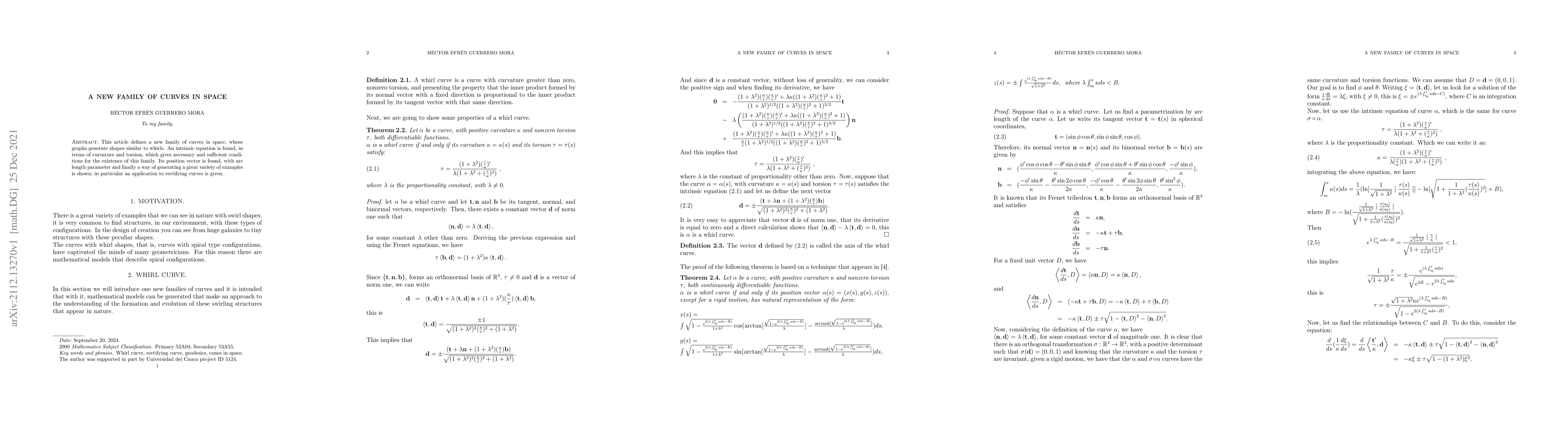 This article defines a new family of curves in space, whose graphs generate shapes similar to whirls. An intrinsic equation is found, in terms of curvature and torsion, which gives necessary and sufficient conditions for the existence of this family. Its position vector is found, with arc length parameter and finally a way of generating a great variety of examples is shown; in particular an application to rectifying curves is given.