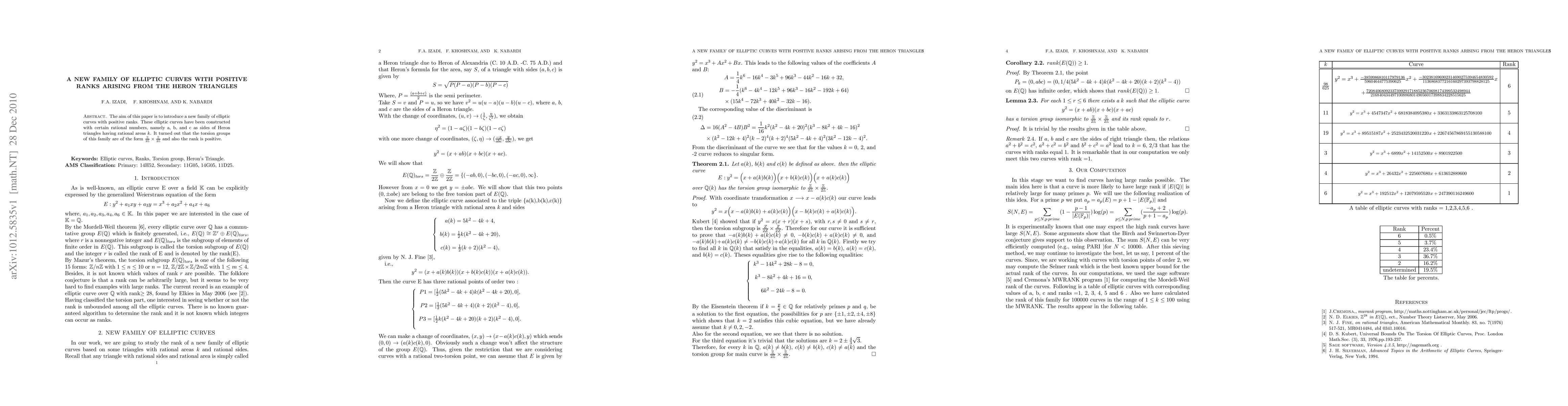 This paper introduces a new family of elliptic curves constructed from Heron triangles, characterized by rational sides and areas, with positive ranks and torsion groups of the form $\frac{\Bbb{Z}}{2\Bbb{Z}}\times \frac{\Bbb{Z}}{2\Bbb{Z}}$. The study highlights the positive rank of these curves.