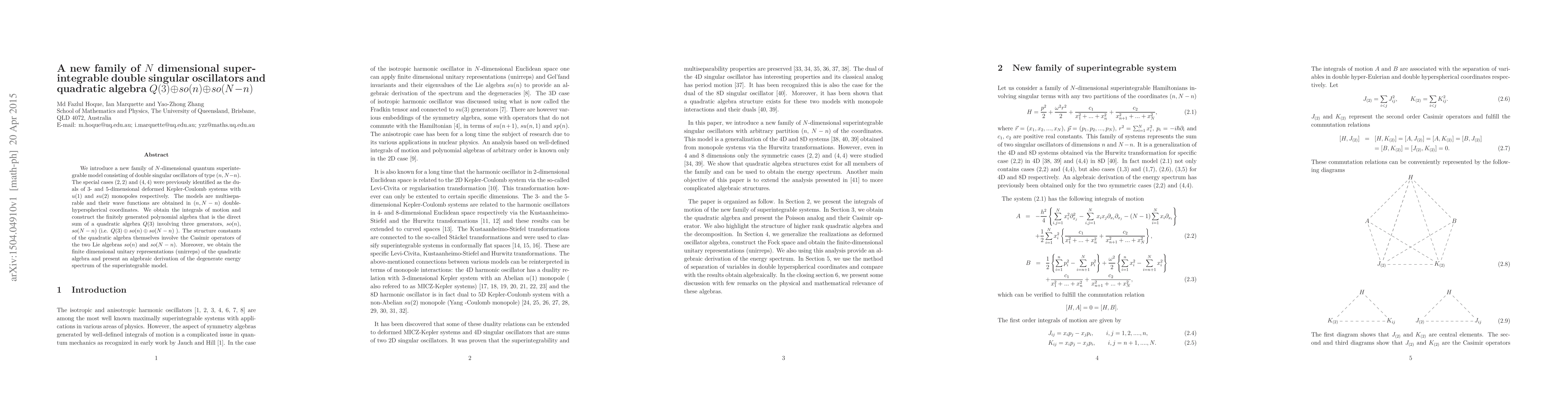 We introduce a new family of $N$-dimensional quantum superintegrable model consisting of double singular oscillators of type $(n,N-n)$. The special cases $(2,2)$ and $(4,4)$ were previously identified as the duals of 3- and 5-dimensional deformed Kepler-Coulomb systems with $u(1)$ and $su(2)$ monopoles respectively. The models are multiseparable and their wave functions are obtained in $(n,N-n)$ double-hyperspherical coordinates. We obtain the integrals of motion and construct the finitely generated polynomial algebra that is the direct sum of a quadratic algebra $Q(3)$ involving three generators, $so(n)$, $so(N-n)$ (i.e. $Q(3)\oplus so(n) \oplus so(N-n)$ ). The structure constants of the quadratic algebra themselves involve the Casimir operators of the two Lie algebras $so(n)$ and $so(N-n)$. Moreover, we obtain the finite dimensional unitary representations (unirreps) of the quadratic algebra and present an algebraic derivation of the degenerate energy spectrum of the superintegrable model.