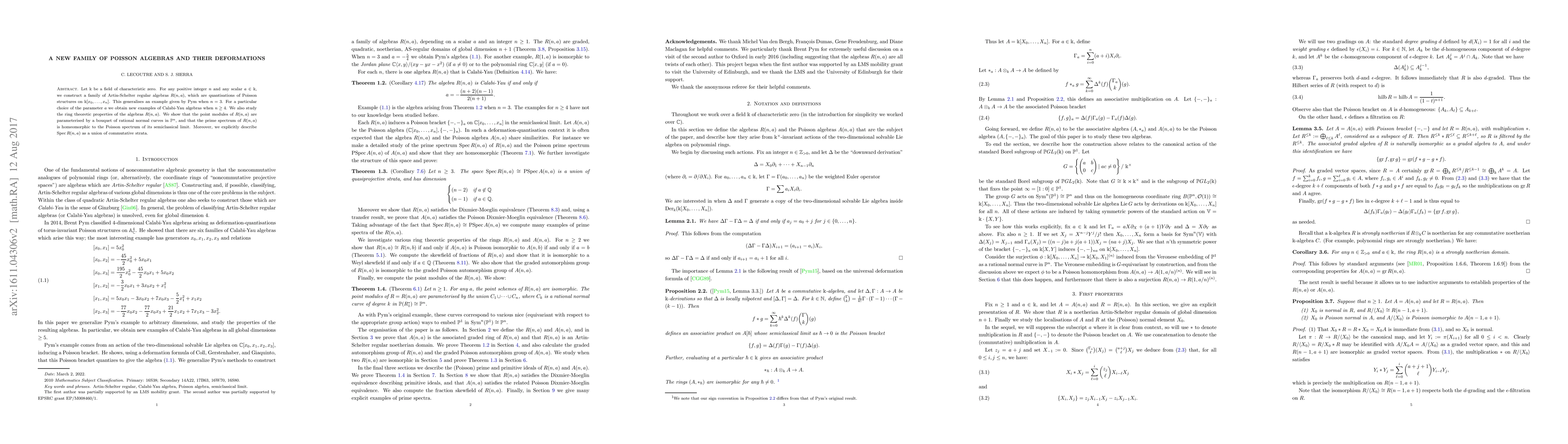 Let $\Bbbk$ be a field of characteristic zero. For any positive integer $n$ and any scalar $a\in\Bbbk$, we construct a family of Artin-Schelter regular algebras $R(n,a)$, which are quantisations of Poisson structures on $\Bbbk[x_0,\dots,x_n]$. This generalises an example given by Pym when $n=3$. For a particular choice of the parameter $a$ we obtain new examples of Calabi-Yau algebras when $n\geq 4$. We also study the ring theoretic properties of the algebras $R(n,a)$. We show that the point modules of $R(n,a)$ are parameterised by a bouquet of rational normal curves in $\mathbb{P}^{n}$, and that the prime spectrum of $R(n,a)$ is homeomorphic to the Poisson spectrum of its semiclassical limit. Moreover, we explicitly describe ${\rm Spec}\ R(n,a)$ as a union of commutative strata.