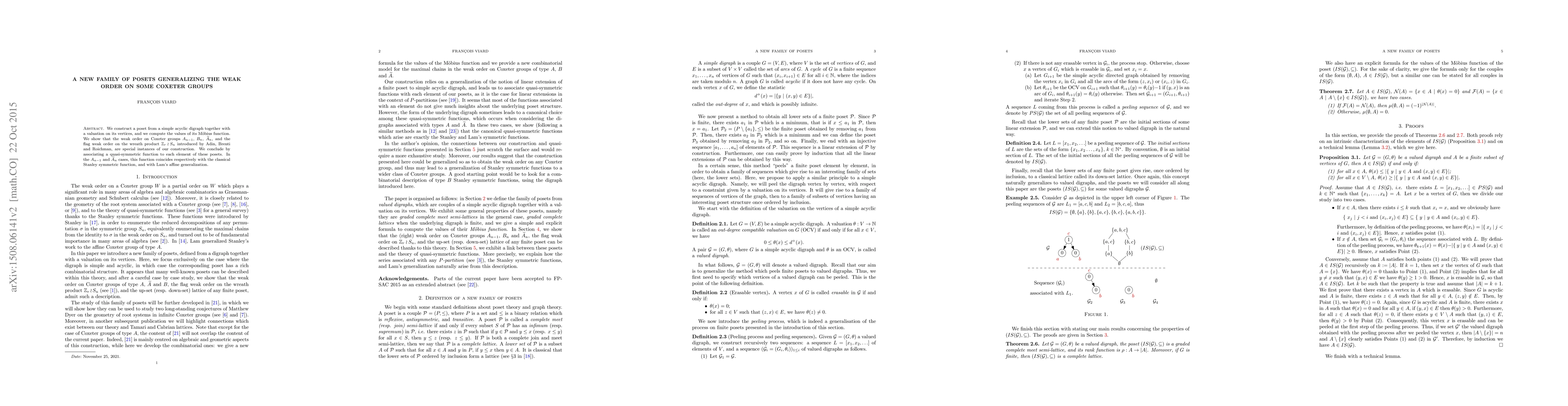 This paper constructs a new family of posets from simple acyclic digraphs with vertex valuations, showing that they generalize the weak orders on certain Coxeter groups. It also associates quasi-symmetric functions to elements of these posets, matching classical symmetric functions in specific cases.