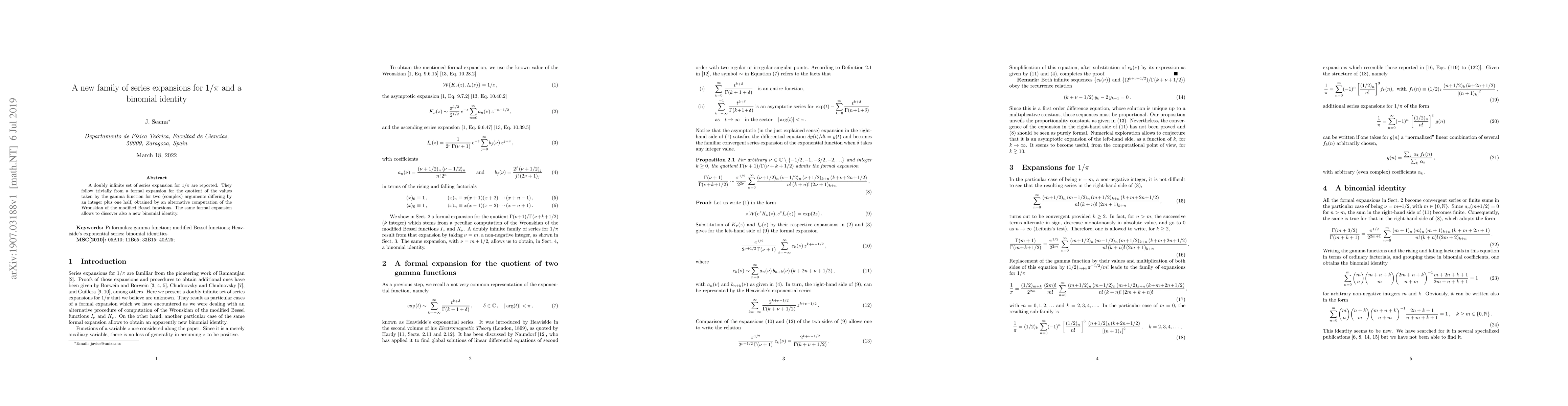A doubly infinite set of series expansion for $1/\pi$ are reported. They follow trivially from a formal expansion for the quotient of the values taken by the gamma function for two (complex) arguments differing by an integer plus one half, obtained by an alternative computation of the Wronskian of the modified Bessel functions. The same formal expansion allows to discover also a new binomial identity.