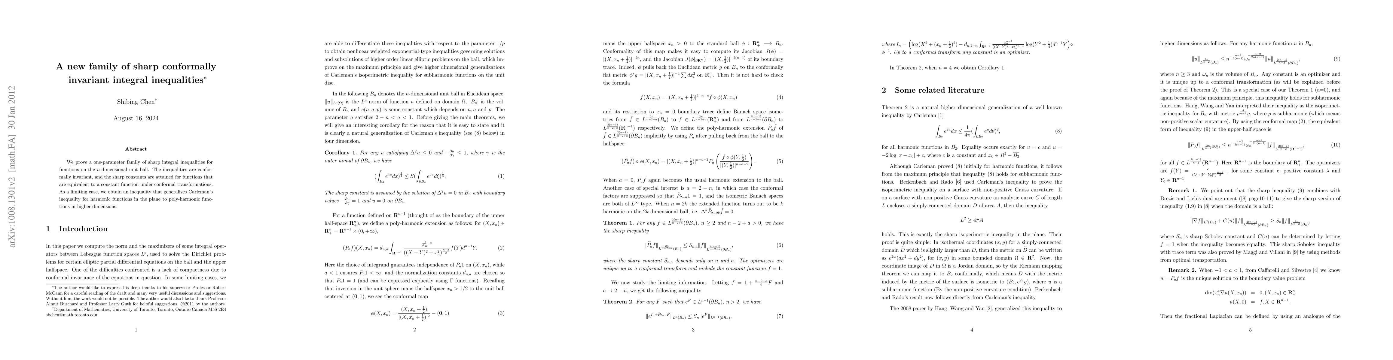 This paper establishes a new family of sharp, conformally invariant integral inequalities for functions on the $n$-dimensional unit ball, with sharp constants achieved for functions invariant under conformal transformations. It also generalizes Carleman's inequality for harmonic functions to higher-dimensional poly-harmonic functions.