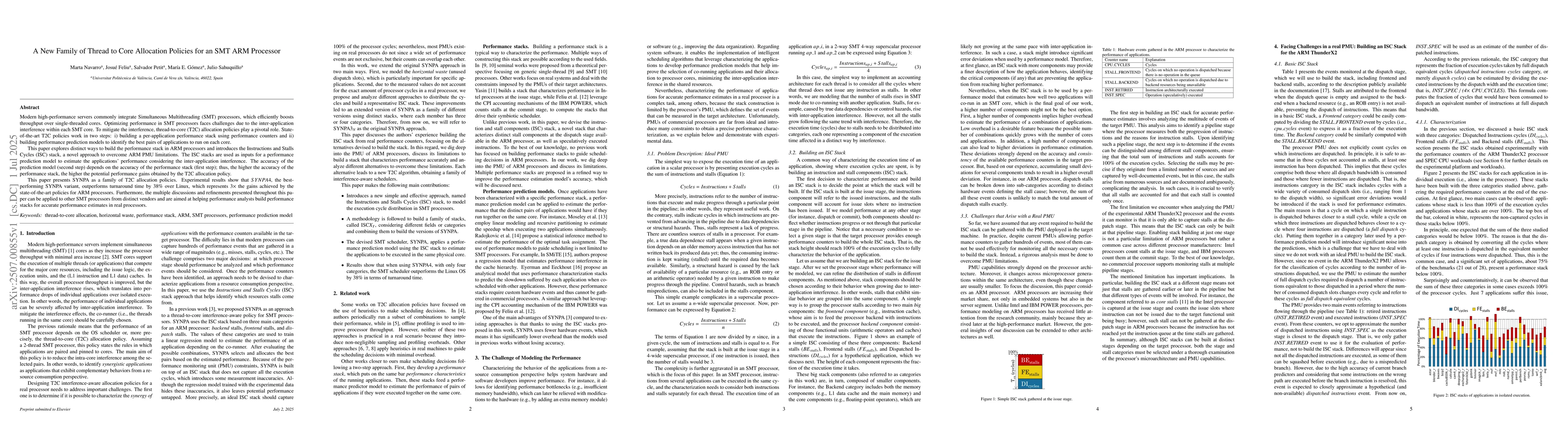 Modern high-performance servers commonly integrate Simultaneous Multithreading (SMT) processors, which efficiently boosts throughput over single-threaded cores. Optimizing performance in SMT processors faces challenges due to the inter-application interference within each SMT core. To mitigate the interference, thread-to-core (T2C) allocation policies play a pivotal role. State-of-the-art T2C policies work in two steps: i) building a per-application performance stack using performance counters and ii) building performance prediction models to identify the best pairs of applications to run on each core. This paper explores distinct ways to build the performance stack in ARM processors and introduces the Instructions and Stalls Cycles (ISC) stack, a novel approach to overcome ARM PMU limitations. The ISC stacks are used as inputs for a performance prediction model to estimate the applications' performance considering the inter-application interference. The accuracy of the prediction model (second step) depends on the accuracy of the performance stack (first step); thus, the higher the accuracy of the performance stack, the higher the potential performance gains obtained by the T2C allocation policy. This paper presents SYNPA as a family of T2C allocation policies. Experimental results show that $SYNPA4$, the best-performing SYNPA variant, outperforms turnaround time by 38\% over Linux, which represents 3$\times$ the gains achieved by the state-of-the-art policies for ARM processors. Furthermore, the multiple discussions and refinements presented throughout this paper can be applied to other SMT processors from distinct vendors and are aimed at helping performance analysts build performance stacks for accurate performance estimates in real processors.