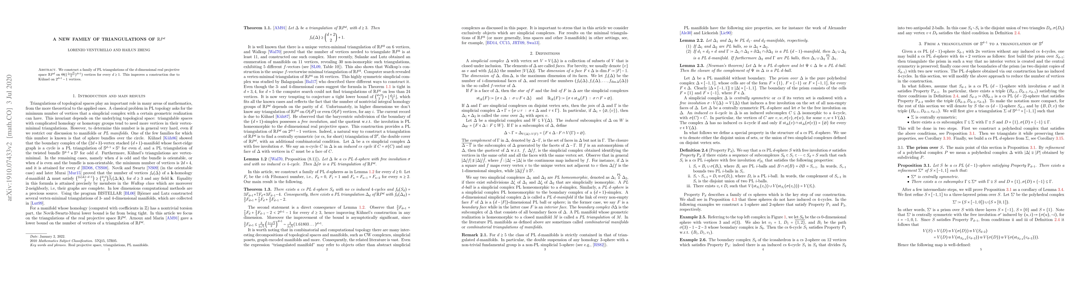 A new family of triangulations of $ ext{R}P^d$ is constructed with $\Theta((\frac{1+\sqrt{5}}{2})^{d+1})$ vertices for every $d geq 1$, improving an existing construction by a factor of two.