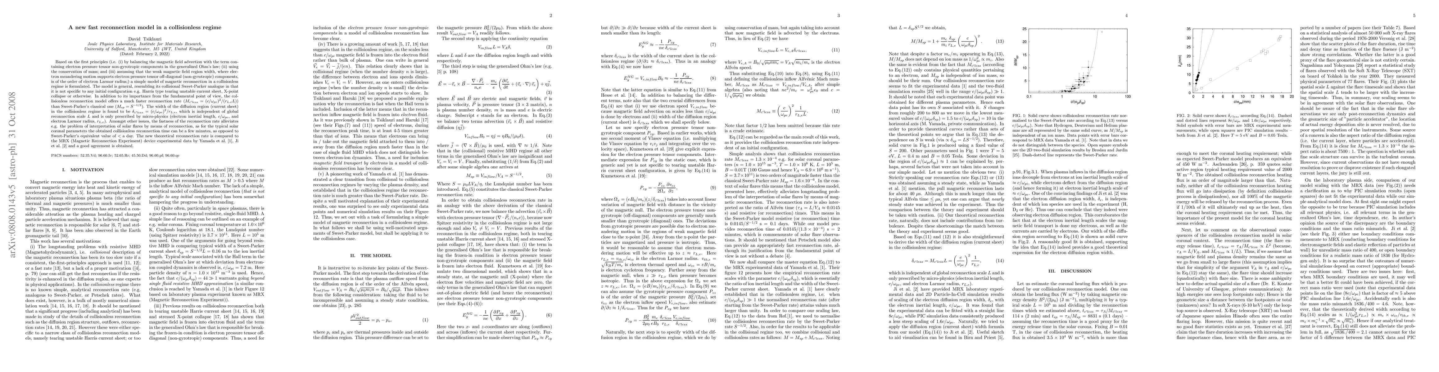 This paper proposes a new fast reconnection model in a collisionless regime, derived from first principles and micro-physical assumptions. The model predicts a much faster reconnection rate than the classical Sweet-Parker model, which is supported by experimental data from MRX device and can resolve the interpretation of solar flares.