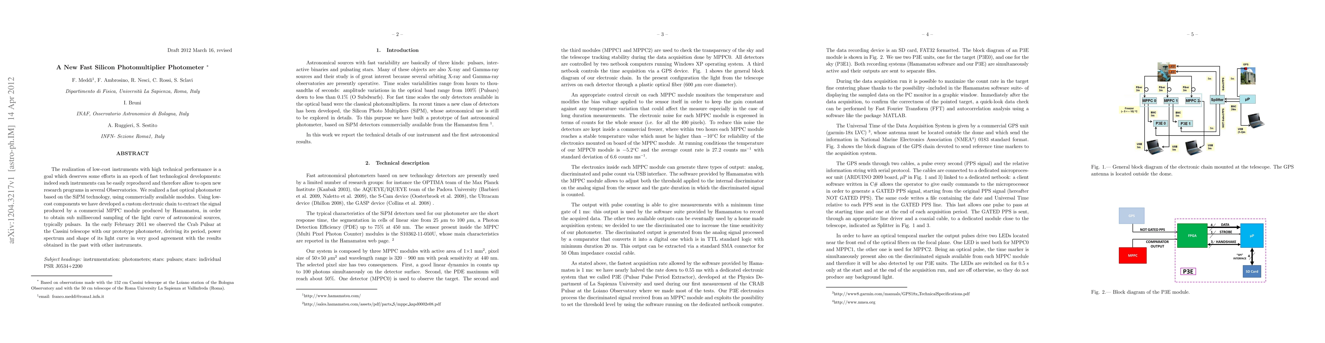 The realization of low-cost instruments with high technical performance is a goal which deserves some efforts in an epoch of fast technological developments: indeed such instruments can be easily reproduced and therefore allow to open new research programs in several Observatories. We realized a fast optical photometer based on the SiPM technology, using commercially available modules. Using low-cost components we have developed a custom electronic chain to extract the signal produced by a commercial MPPC module produced by Hamamatsu, in order to obtain sub millisecond sampling of the light curve of astronomical sources, typically pulsars. In the early February 2011 we observed the Crab Pulsar at the Cassini telescope with our prototype photometer, deriving its period, power spectrum and shape of its light curve in very good agreement with the results obtained in the past with other instruments.