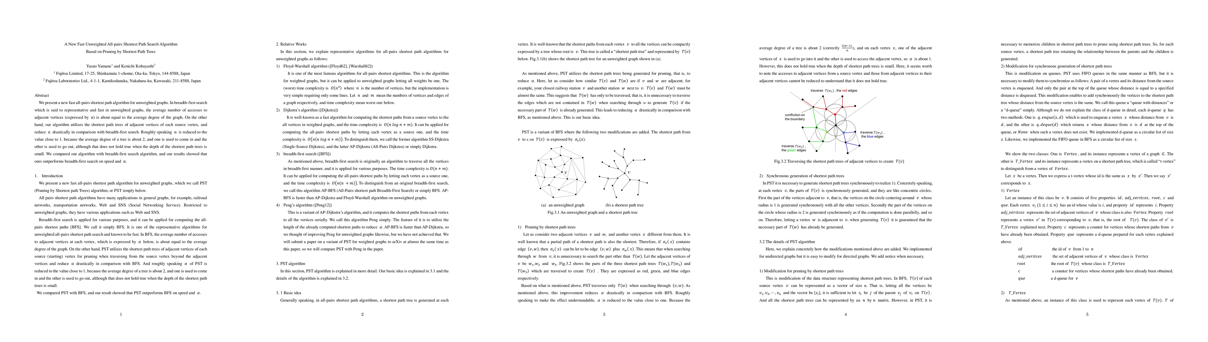 The paper presents a new all-pairs shortest path search algorithm for unweighted graphs, named PST, which reduces the average number of adjacent vertex accesses (α) to values close to 1 by pruning based on shortest path trees of adjacent vertices of a source vertex when the depth of the shortest paths is relatively large.