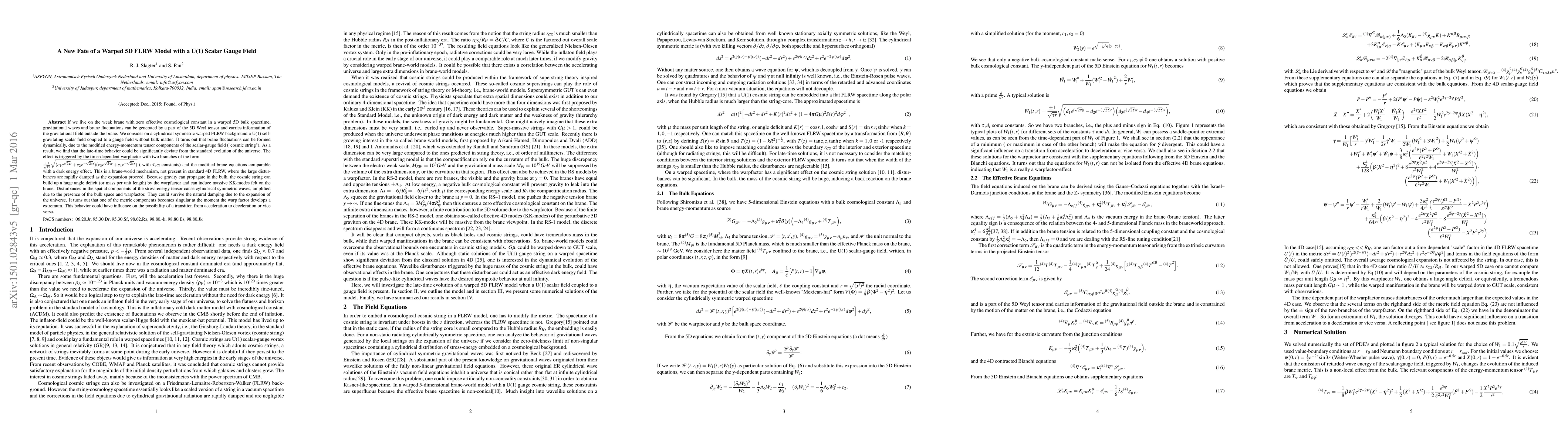 If we live on the weak brane with zero effective cosmological constant in a warped 5D bulk spacetime, gravitational waves and brane fluctuations can be generated by a part of the 5D Weyl tensor and carries information of the gravitational field outside the brane. We consider on a cylindrical symmetric warped FRW background the U(1) self-gravitating scalar-gauge field without bulk matter. It turns out that "branons" can be formed dynamically, due to the modified energy-momentum tensor components of the cosmic string. As a result, we find that the late-time behavior could be significant deviate from the standard evolution of the universe. The effect is triggered by the time-dependent warp factor, of the form $\sqrt{ae^{\tau t}+be^{-\tau t}}$ and the modified brane equations, comparable with a dark energy effect. This is a brane-world mechanism, not present is standard 4D FRW, where the large disturbances are rapidly damped as the expansion proceed. Because gravity can propagate in the bulk, the cosmic string can build up a huge angle deficit (or mass per unit length) by the warp factor. Disturbances in the spatial components of the stress-energy tensor cause cylindrical symmetric waves, amplified due to the presence of the bulk space and warpfactor. This long range effect could also explain the recently found spooky alignment of quasars in vast structures in the cosmic web.