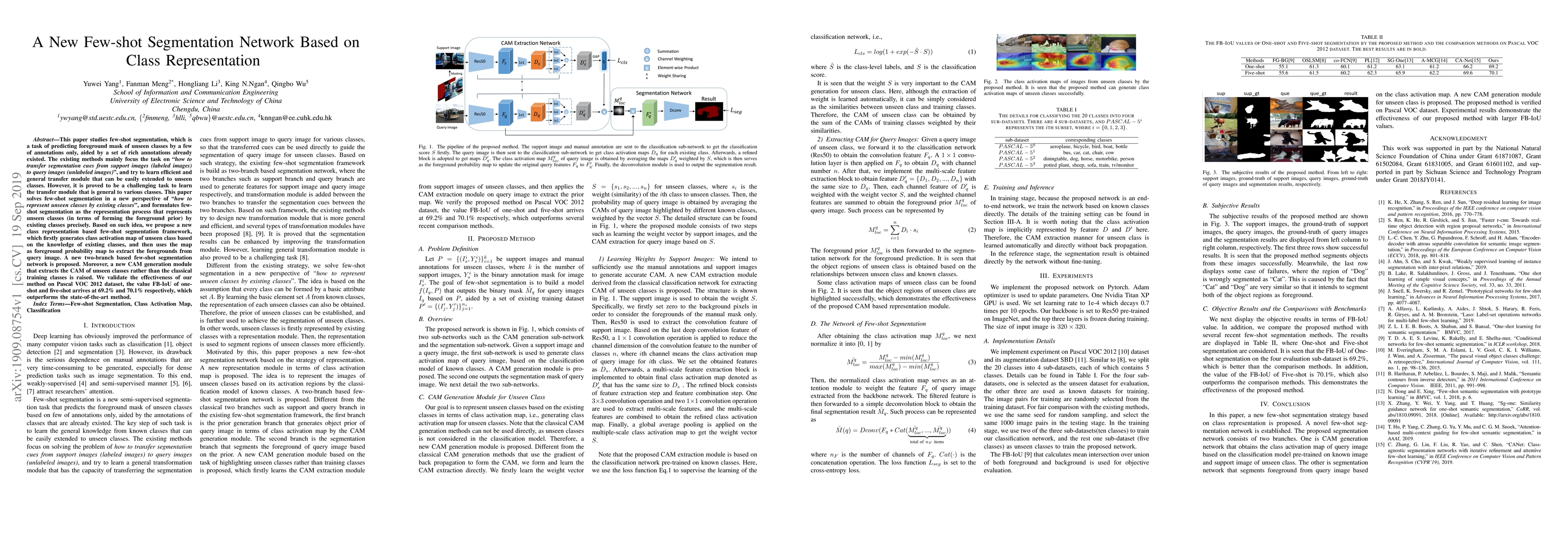 This paper proposes a novel few-shot segmentation network that represents unseen classes using existing classes to generate class activation maps, which are then used to predict foreground masks in unlabeled images. The new two-branch network and CAM generation module achieve superior performance on the Pascal VOC 2012 dataset, outperforming existing methods.