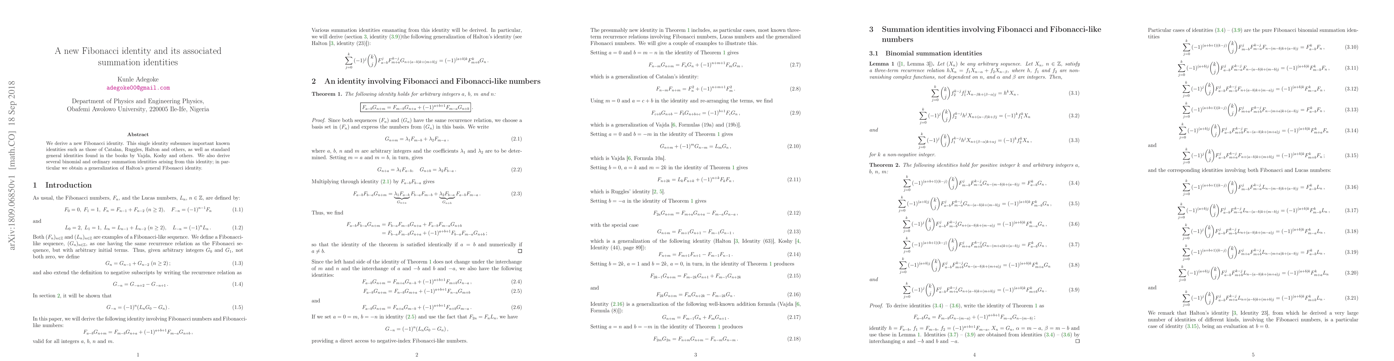 The paper presents a novel Fibonacci identity that encompasses several known identities and derives new binomial and summation identities, including a generalization of Halton's identity. These findings extend the existing mathematical framework for Fibonacci sequences.