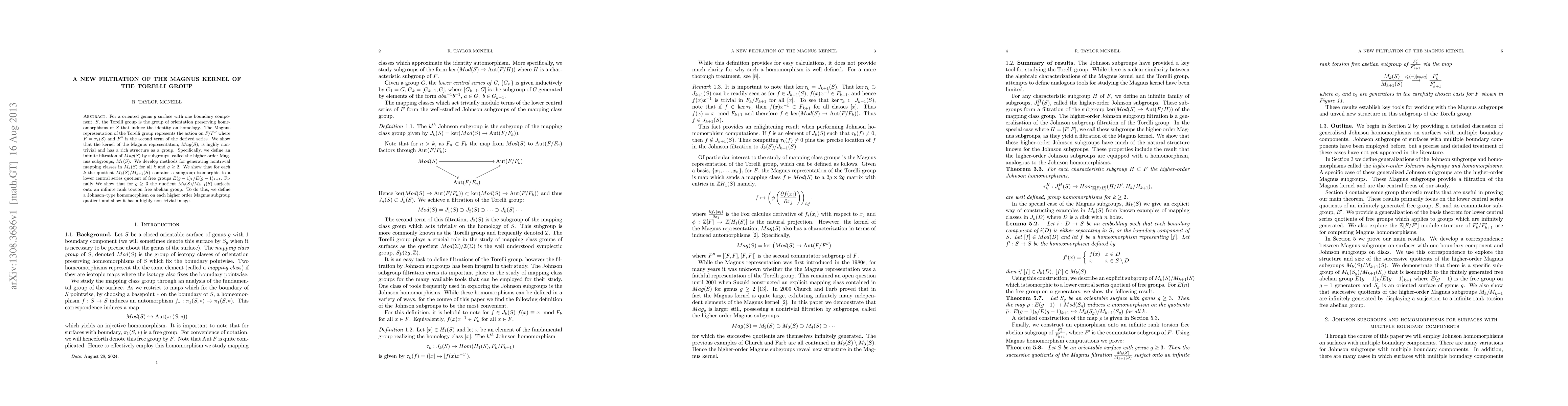 This paper introduces a new infinite filtration of the Magnus kernel of the Torelli group for oriented genus g surfaces, defining higher order Magnus subgroups M_k(S). The authors demonstrate that these subgroups have intricate structures and generate nontrivial mapping classes, with quotients isomorphic to lower central series quotients of free groups.