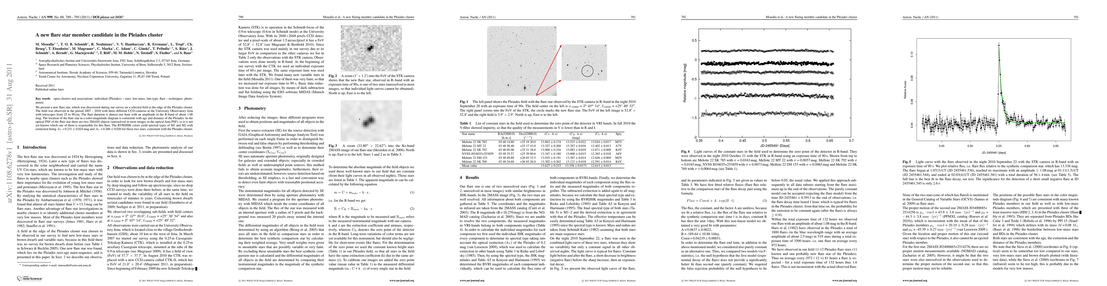 We present a new flare star, which was discovered during our survey on a selected field at the edge of the Pleiades cluster. The field was observed in the period 2007 - 2010 with three different CCD-cameras at the University Observatory Jena with telescopes from 25 to 90 cm. The flare duration is almost one hour with an amplitude in the R-band of about 1.08 mag. The location of the flare star in a color-magnitude diagram is consistent with age and distance of the Pleiades. In the optical PSF of the flare star there are two 2MASS objects (unresolved in most images in the optical Jena PSF), so it is not yet known which one of them is responsible for this flare. The BVRIJHK colors yield spectral types of M1 and M2 with extinction being A_V=0.231+/-0.024 mag and A_V=0.266+/-0.020 for those two stars, consistent with the Pleiades cluster.