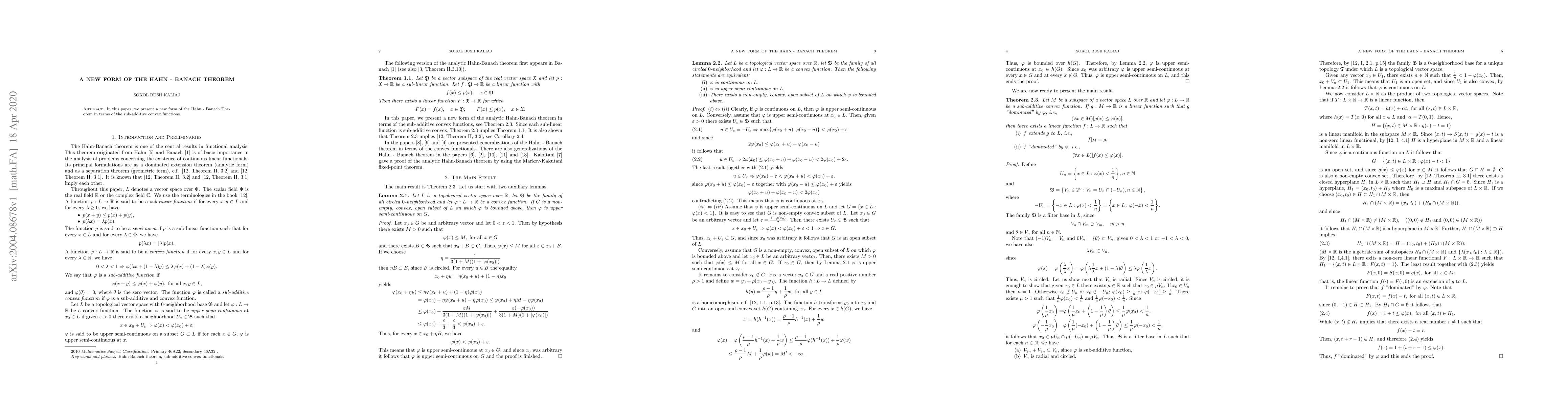 The paper presents a new form of the Hahn-Banach Theorem using sub-additive convex functions, proving auxiliary lemmas and the main result (Theorem 2.3) through topological vector space properties and continuity arguments.