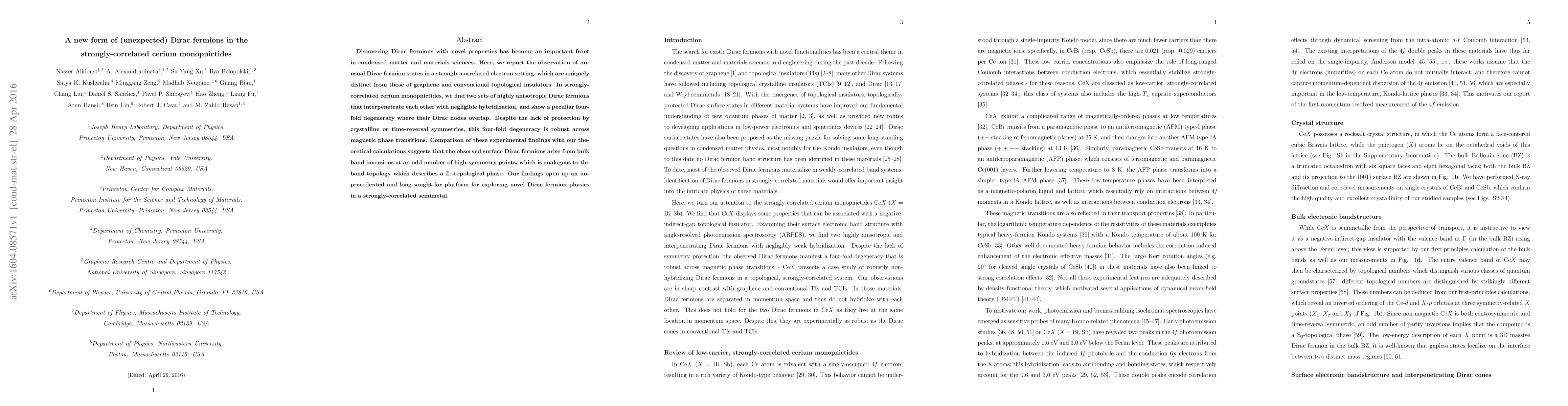 This paper reports the discovery of unusual Dirac fermions in cerium monopnictides, featuring highly anisotropic, interpenetrating Dirac nodes with a robust four-fold degeneracy. The findings suggest a novel $\mathbb{Z}_{2}$-topological phase arising from bulk band inversions, offering a new platform for exploring Dirac fermion physics in strongly-correlated materials.