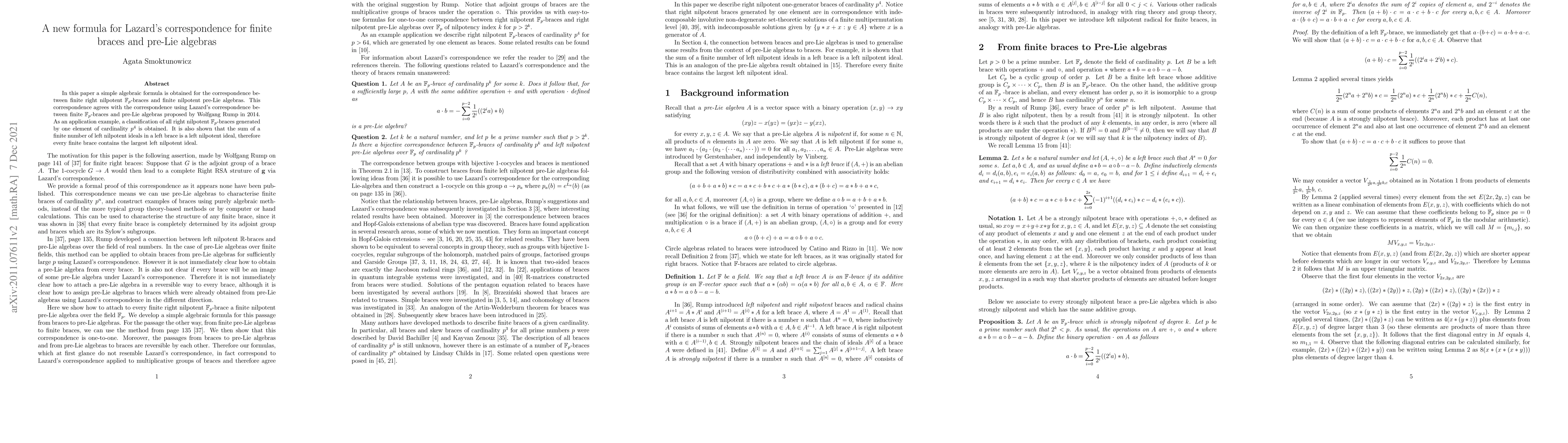In this paper a simple algebraic formula is obtained for the correspondence between finite right nilpotent Fp-braces and finite nilpotent pre-Lie algebras. This correspondence agrees with the correspondence using Lazard's correspondence between finite Fp-braces and pre-Lie algebras proposed by Wolfgang Rump in 2014. As an application example, a classification of all right nilpotent Fp-braces generated by one element of cardinality p^4 is obtained, answering a question posed by Leandro Vendramin. It is also shown that the sum of a finite number of left nilpotent ideals in a left brace is a left nilpotent ideal, therefore every finite brace contains the largest left nilpotent ideal.