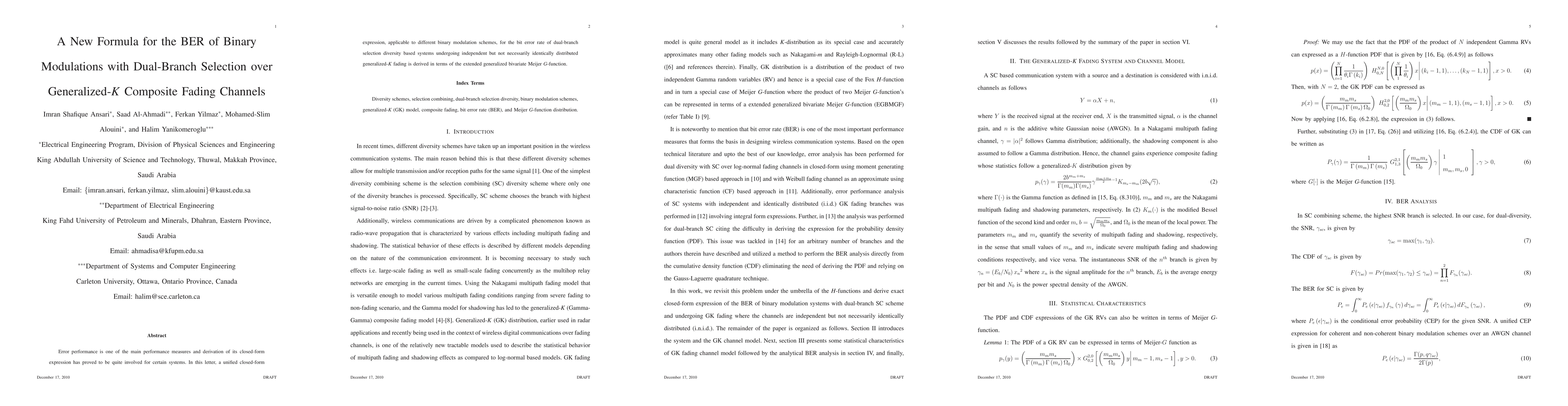 Error performance is one of the main performance measures and derivation of its closed-form expression has proved to be quite involved for certain systems. In this letter, a unified closed-form expression, applicable to different binary modulation schemes, for the bit error rate of dual-branch selection diversity based systems undergoing independent but not necessarily identically distributed generalized-K fading is derived in terms of the extended generalized bivariate Meijer G-function.