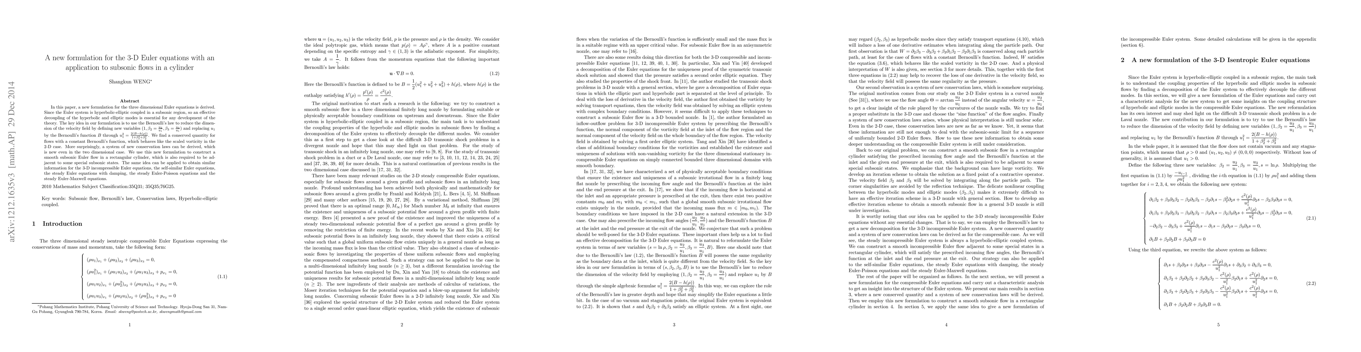 In this paper, a new formulation for the three dimensional Euler equations is derived. Since the Euler system is hyperbolic-elliptic coupled in a subsonic region, so an effective decoupling of the hyperbolic and elliptic modes is essential for any development of the theory. The key idea in our formulation is to use the Bernoulli's law to reduce the dimension of the velocity field by defining new variables $(1,\beta_2=\frac{u_2}{u_1},\beta_3=\frac{u_3}{u_1})$ and replacing $u_1$ by the Bernoulli's function $B$ through $u_1^2=\frac{2(B-h(\rho))}{1+\beta_2^2+\beta_3^2}$. We find a conserved quantity for flows with a constant Bernoulli's function, which behaves like the scaled vorticity in the 2-D case. More surprisingly, a system of new conservation laws can be derived, which is new even in the two dimensional case. We use this new formulation to construct a smooth subsonic Euler flow in a rectangular cylinder, which is also required to be adjacent to some special subsonic states.