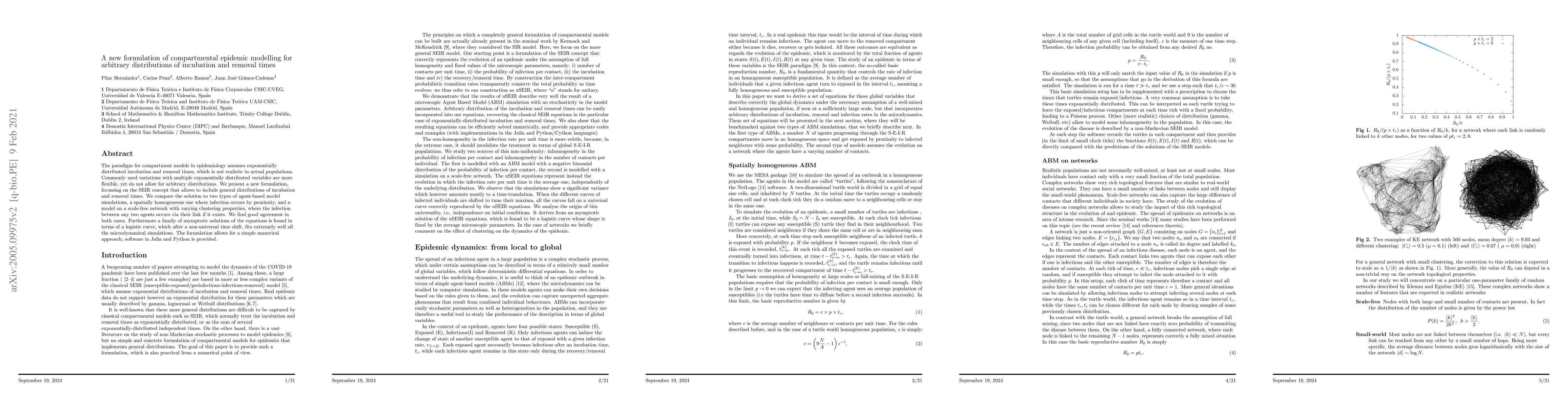 The paradigm for compartment models in epidemiology assumes exponentially distributed incubation and removal times, which is not realistic in actual populations. Commonly used variations with multiple exponentially distributed variables are more flexible, yet do not allow for arbitrary distributions. We present a new formulation, focussing on the SEIR concept that allows to include general distributions of incubation and removal times. We compare the solution to two types of agent-based model simulations, a spatially homogeneous one where infection occurs by proximity, and a model on a scale-free network with varying clustering properties, where the infection between any two agents occurs via their link if it exists. We find good agreement in both cases. Furthermore a family of asymptotic solutions of the equations is found in terms of a logistic curve, which after a non-universal time shift, fits extremely well all the microdynamical simulations. The formulation allows for a simple numerical approach; software in Julia and Python is provided.